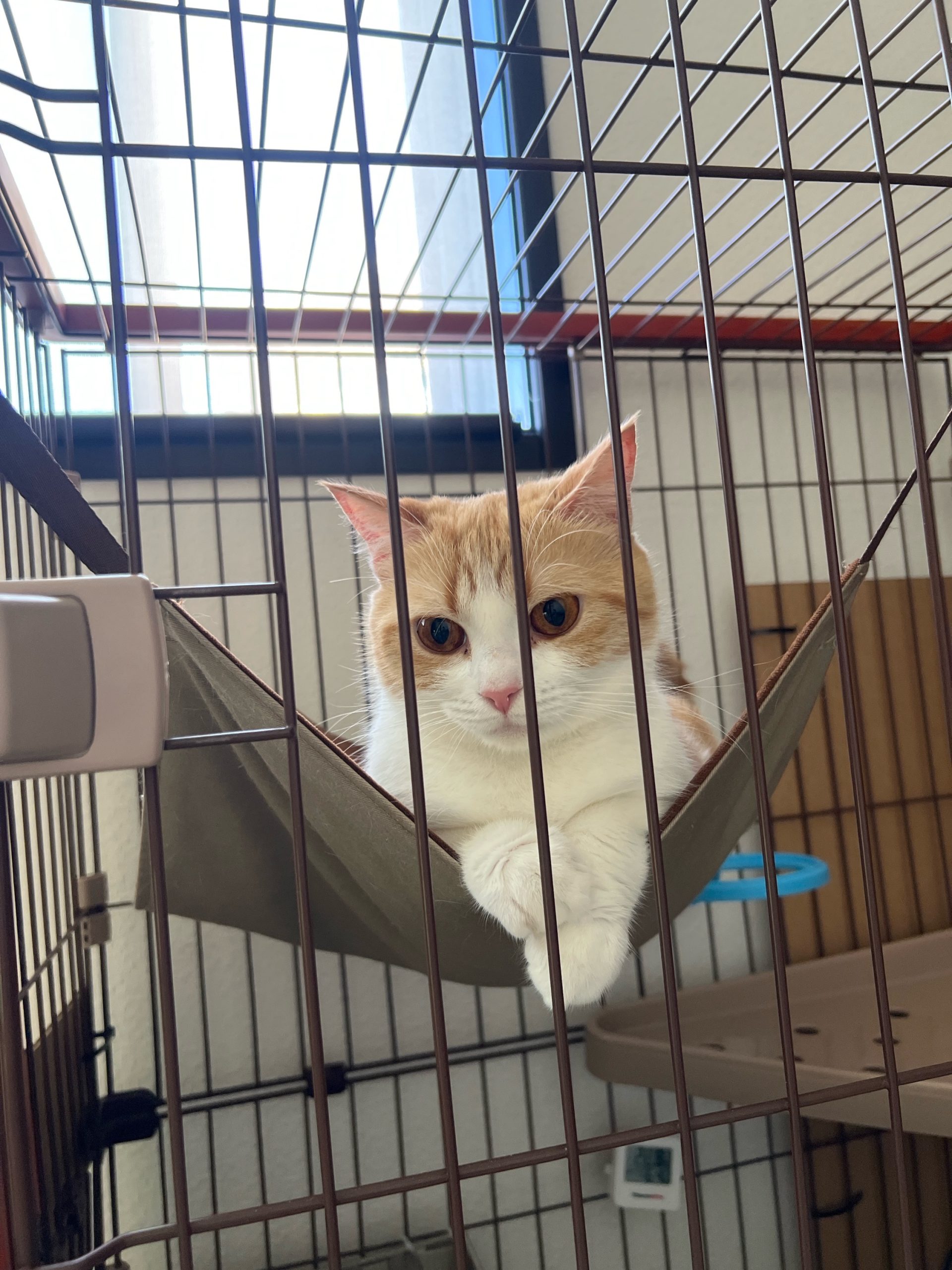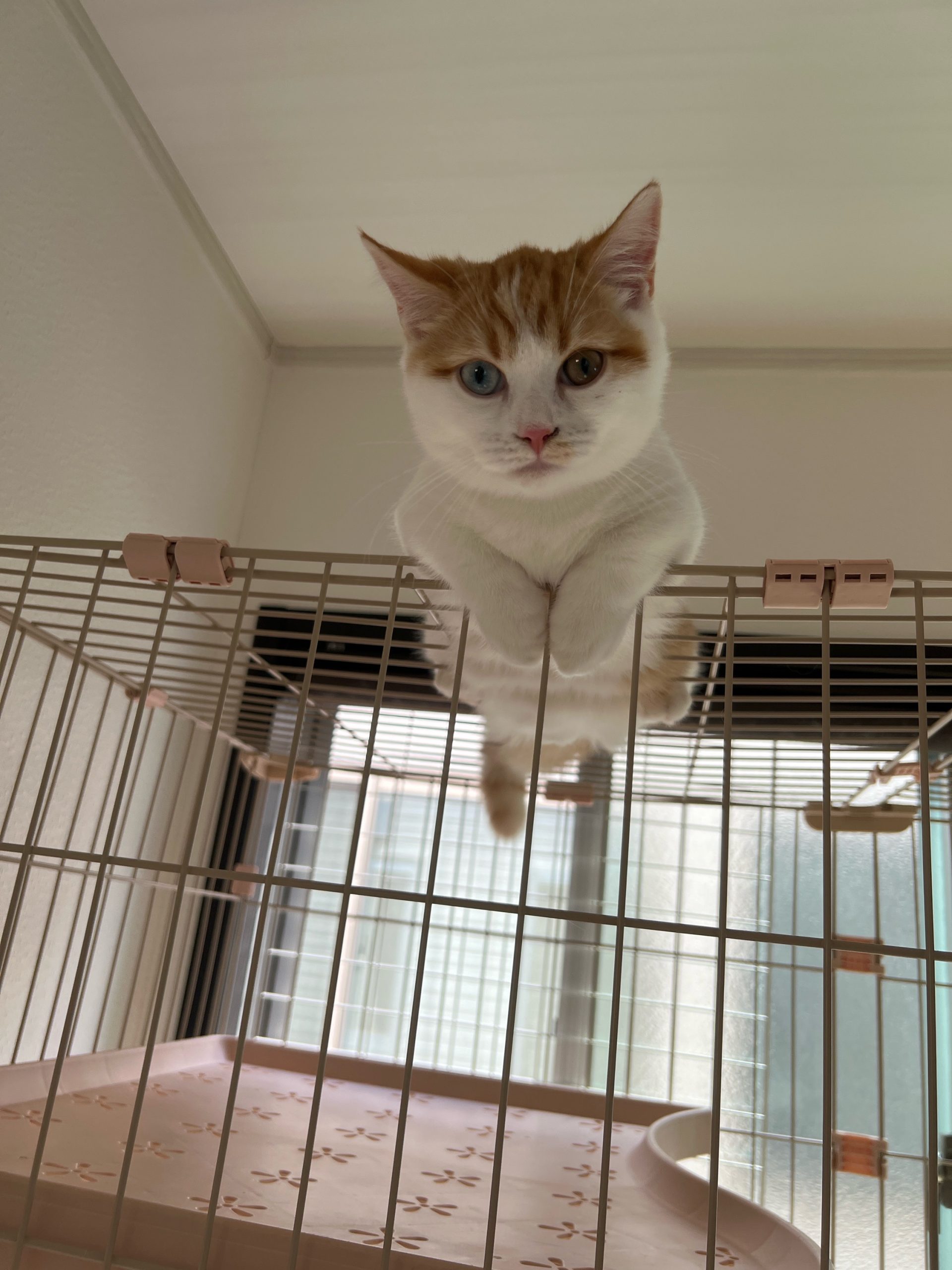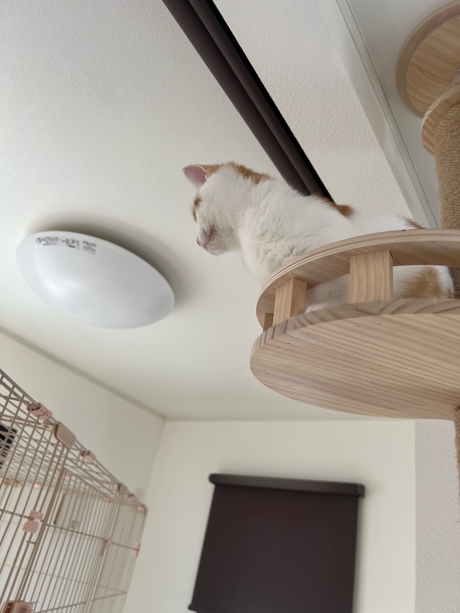 ちくわくんはケージ上から下りれないようで鳴いているのでキャットタワーに移動させましたがそれでも下りれないみたいです