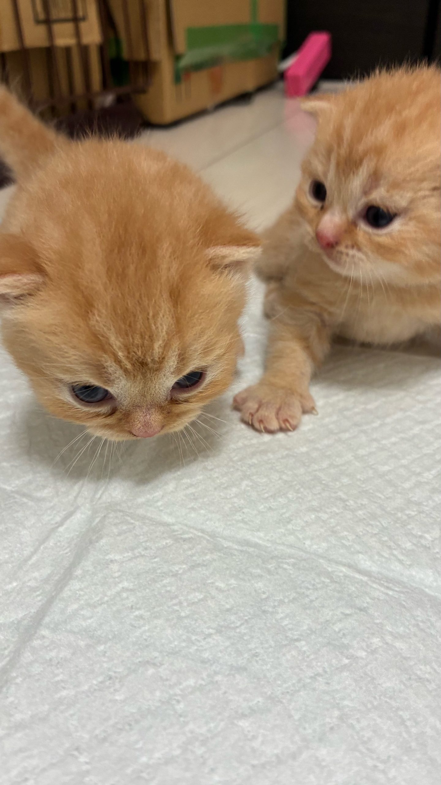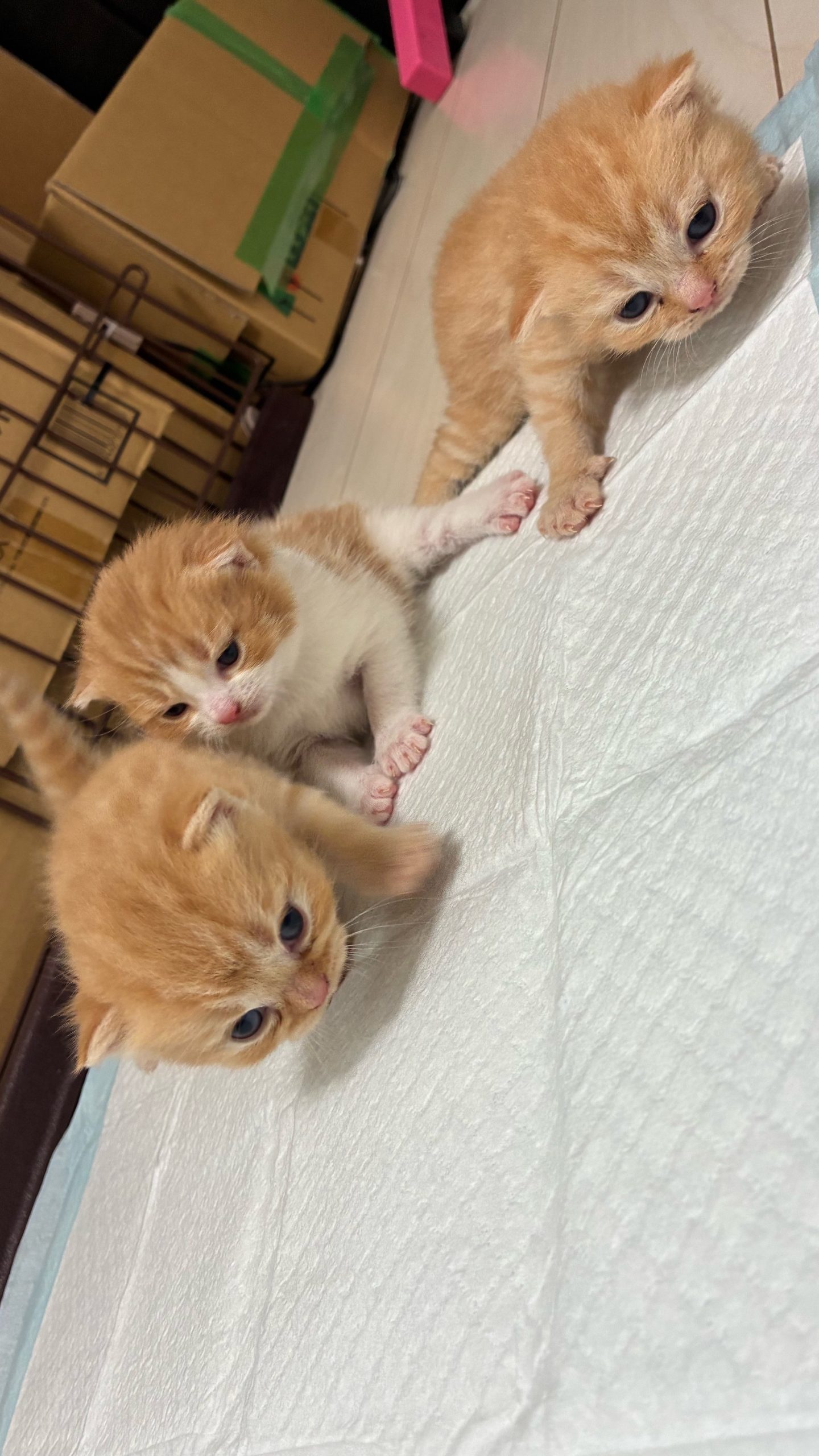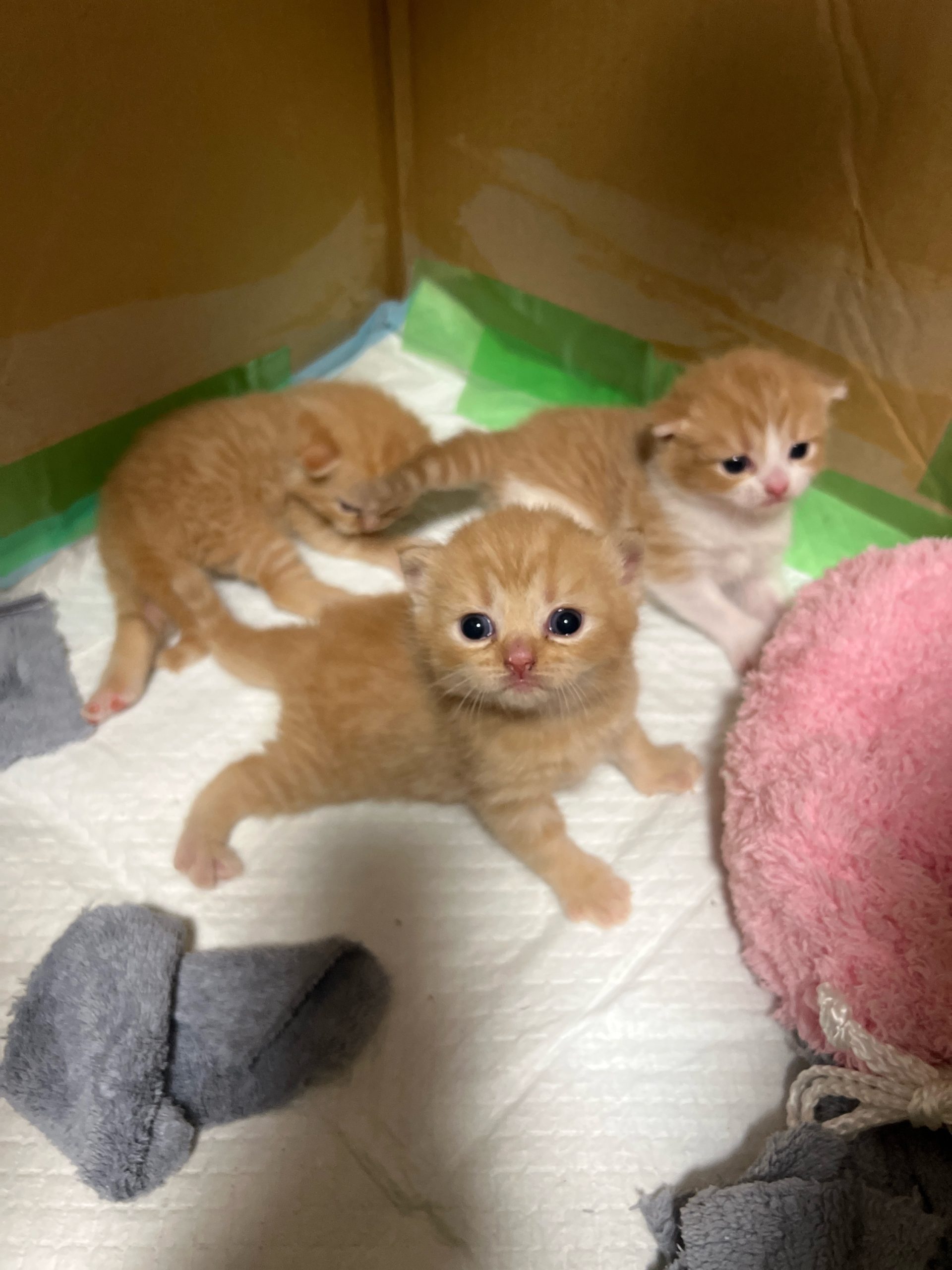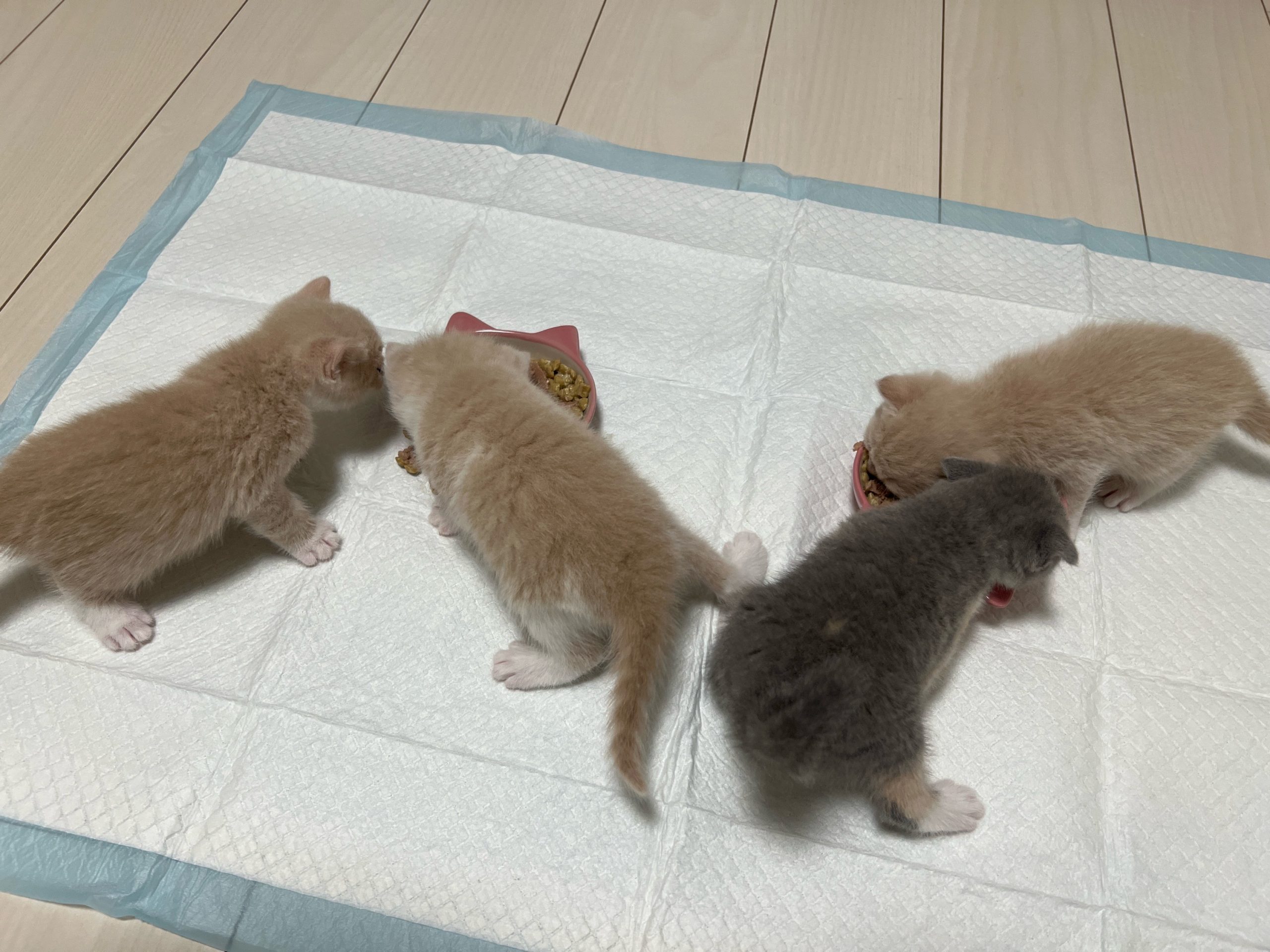 おトイレにも小さな排便がみられるようになってきました💩今日は離乳食をおかわり分もプラスしてはじめからのせました(離乳食1回分+ウェットフード1/8を一皿ずつ)ふた皿を4匹でわけて食べてます。残りはレモン母さんが食べてました🍋今日は4ちゃん以外自分でむしゃむしゃ食べ始め、2.3ちゃんはかなり長く自分で食べてくれました。4ちゃんだけは指であげる補助をしながら少しだけ食べておしまいになってます。