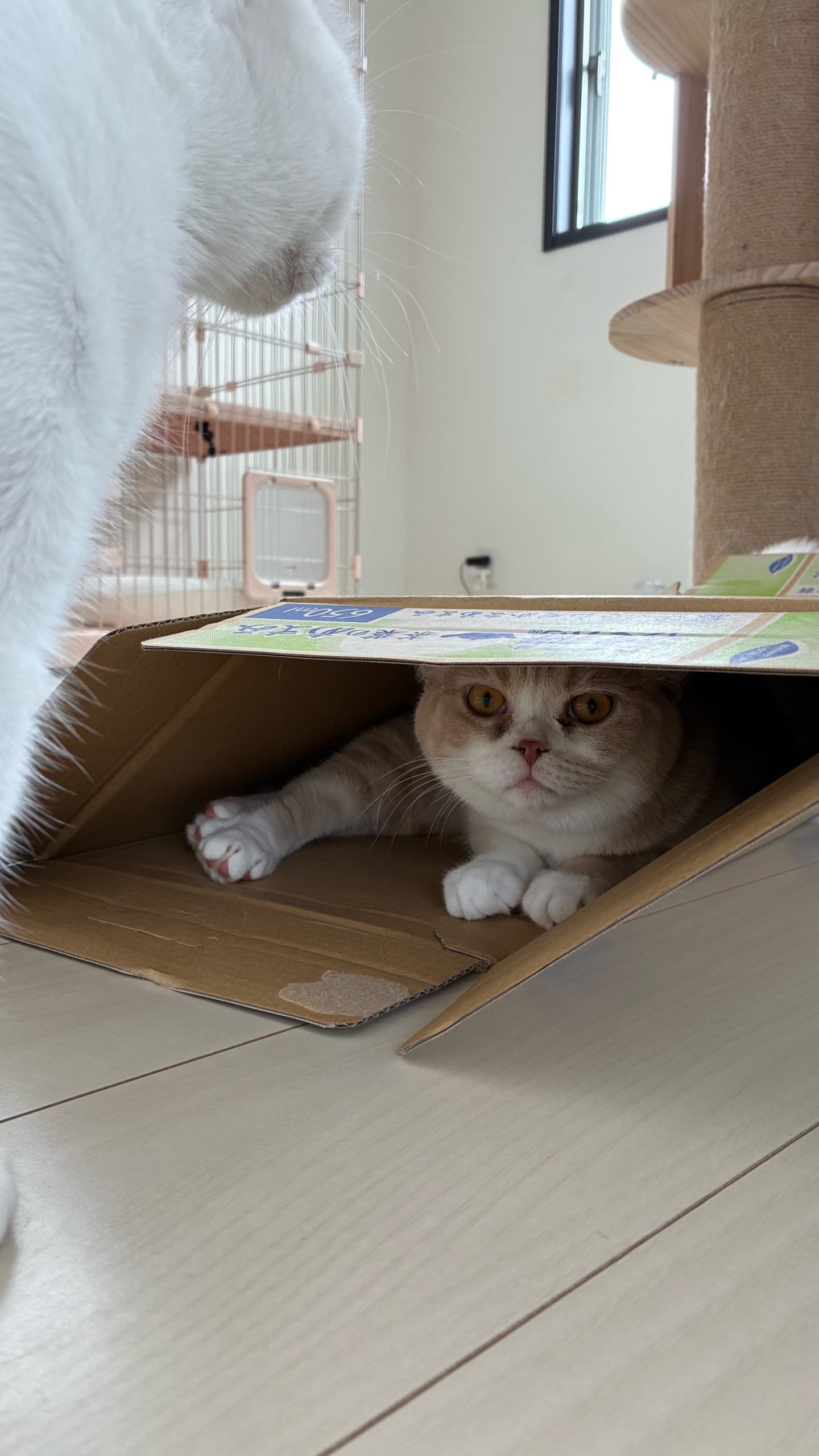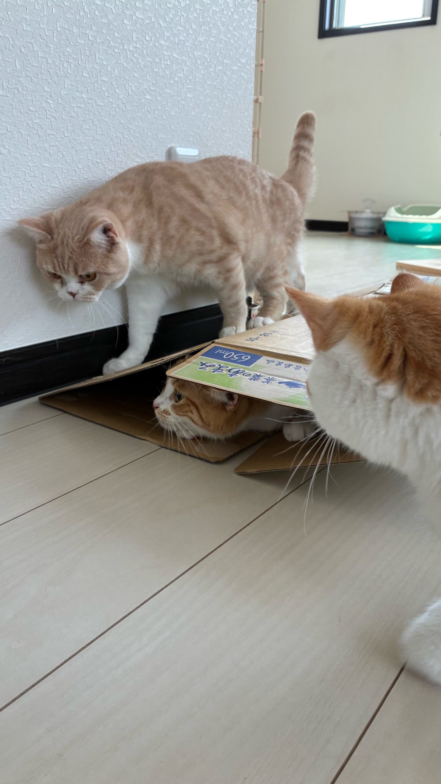 空のダンボールでひと遊びしているのはちくわ、きびまい、むぎちゃんと意外にはなちゃんでした📦