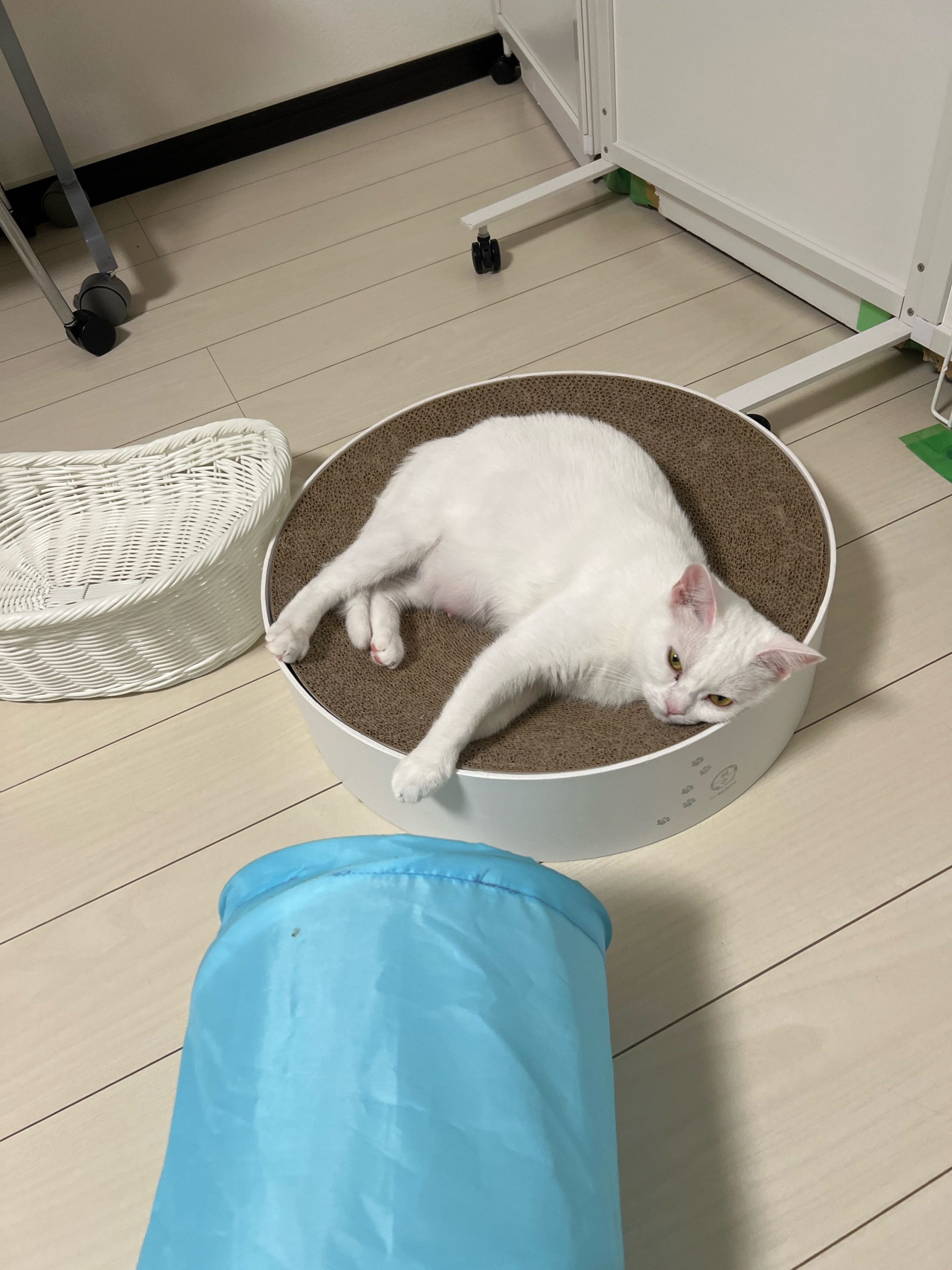 午前:ダンボールの隙間からむぎちゃんキッチン侵入、まったりねてらしゃいました