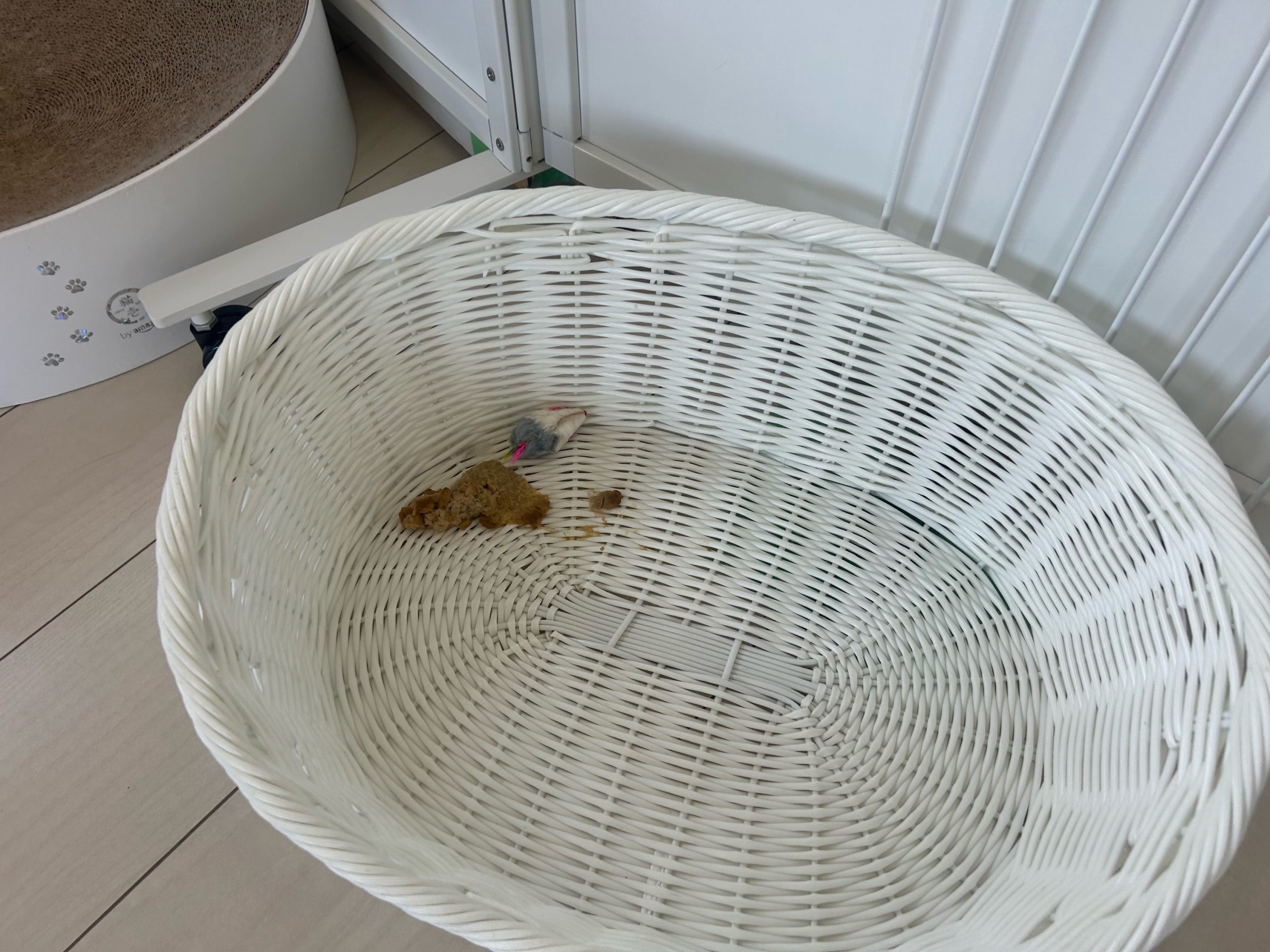 白いカゴに嘔吐がありましたので、洗って浴槽で乾かしています。