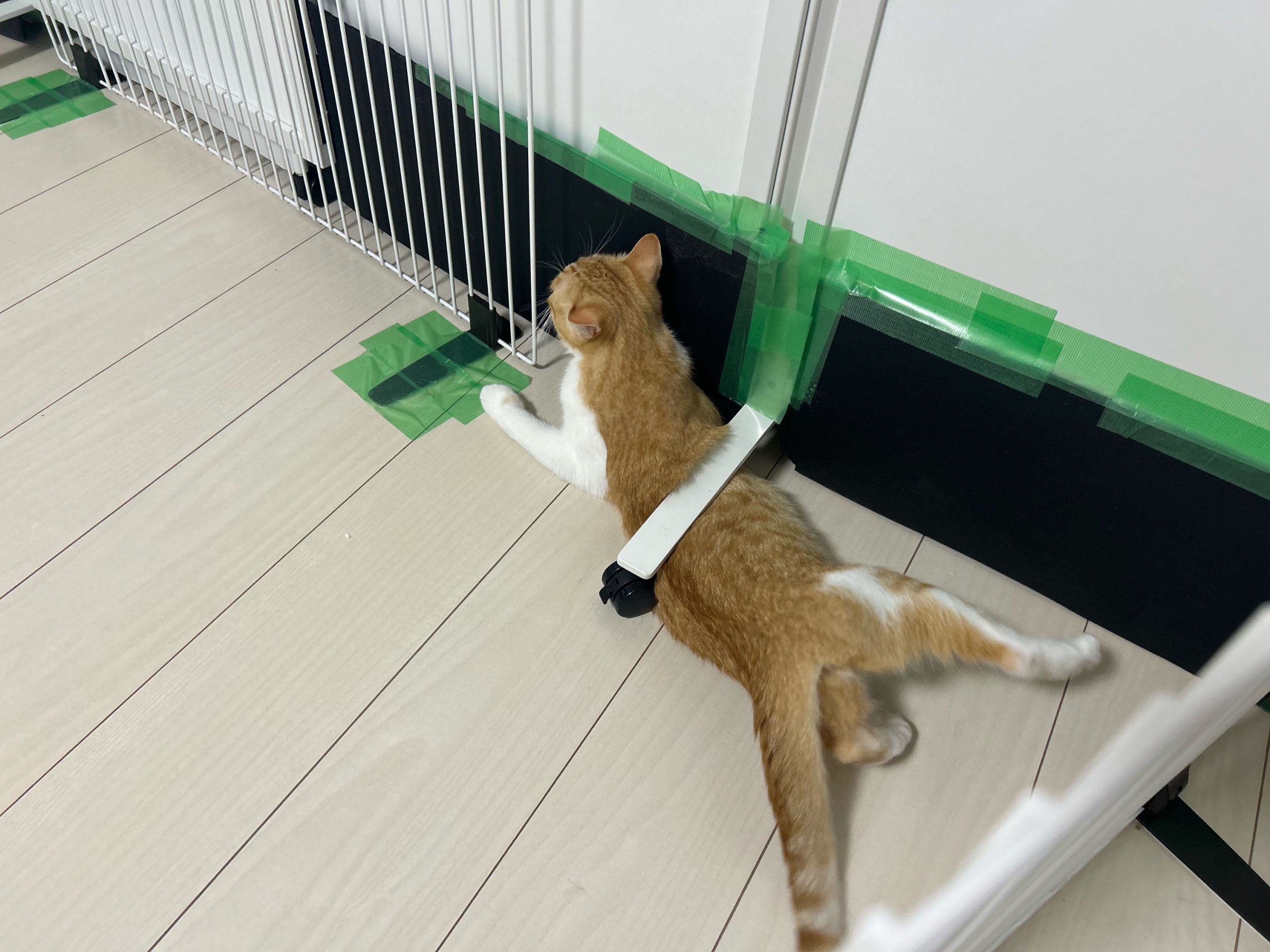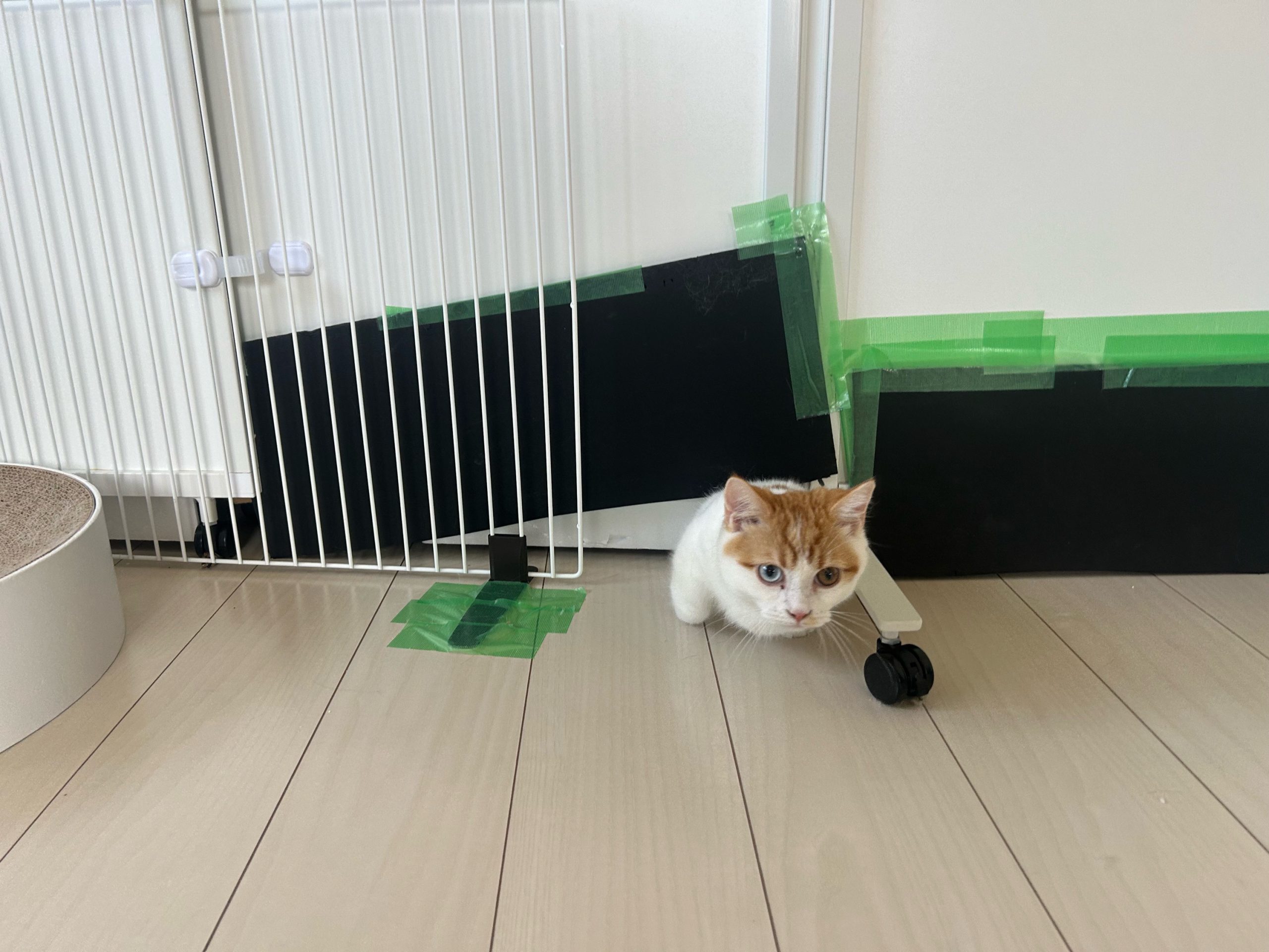2階パーテーションは下から突破できたようで、むぎちゃんは侵入していませんでしたが、ちくわくん・きびまいくん・マロちゃんの3匹が入っていました💦