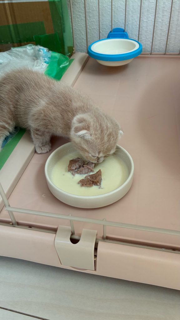 今回はミルクで浸したウェットフードの塊よりも、ウェットフードを崩した状態の方が食べてくれました🍚