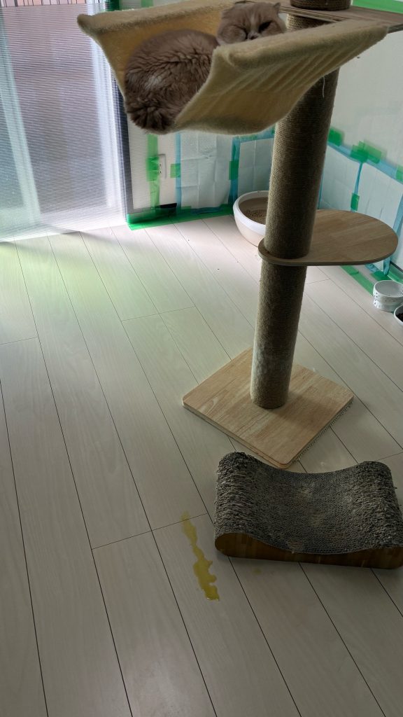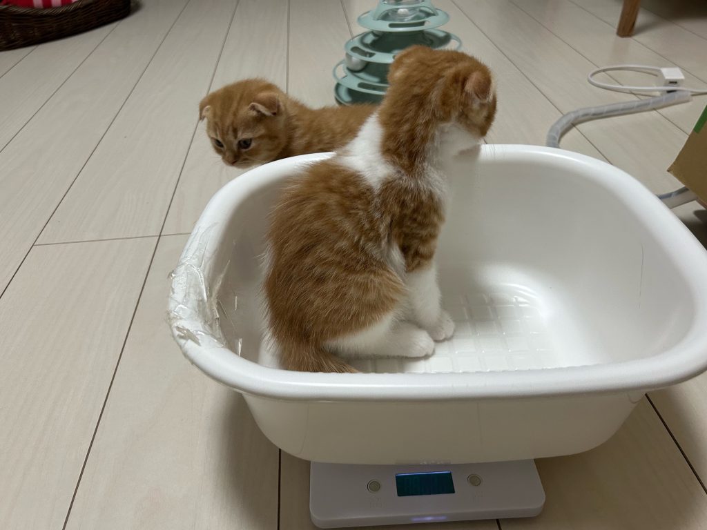作業終盤に2階で赤い排尿?が体重計のおけの中にありました。子猫か他ねこか、だれのかがわからなかったのですぐ子猫たちはケージへ。