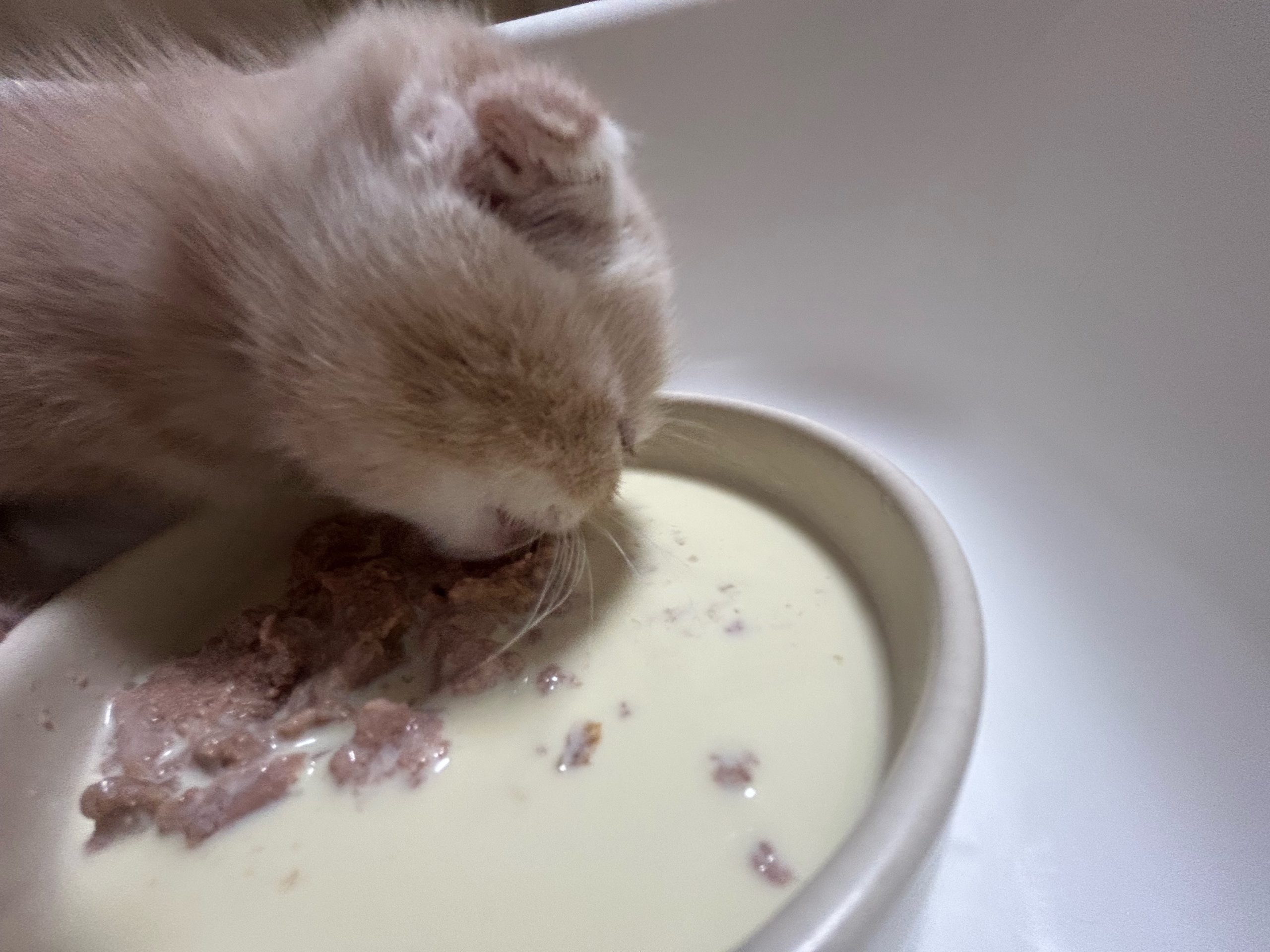 今回はミルクで浸したウェットフードの塊よりも、ウェットフードを崩した状態の方が食べてくれました🍚