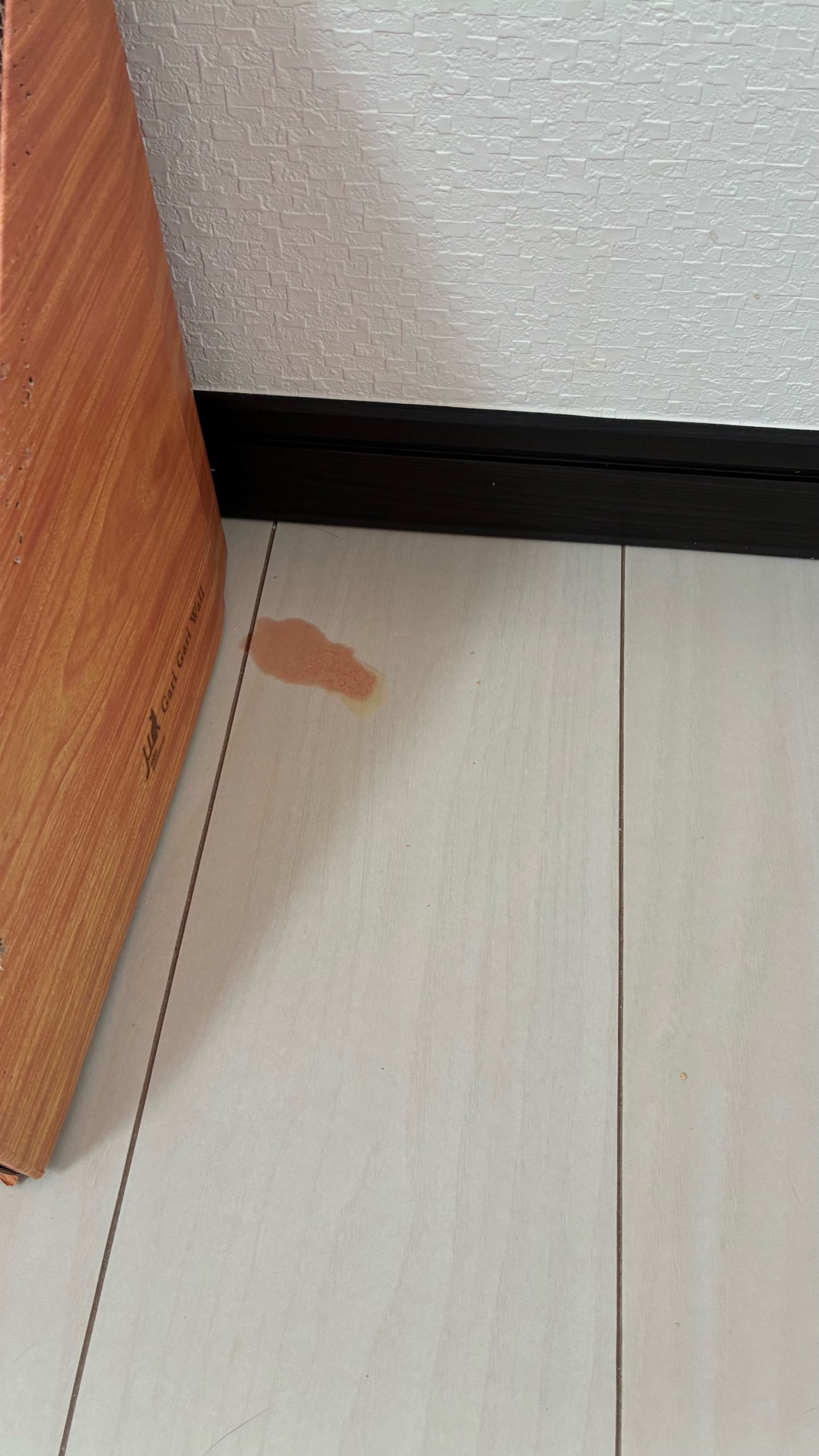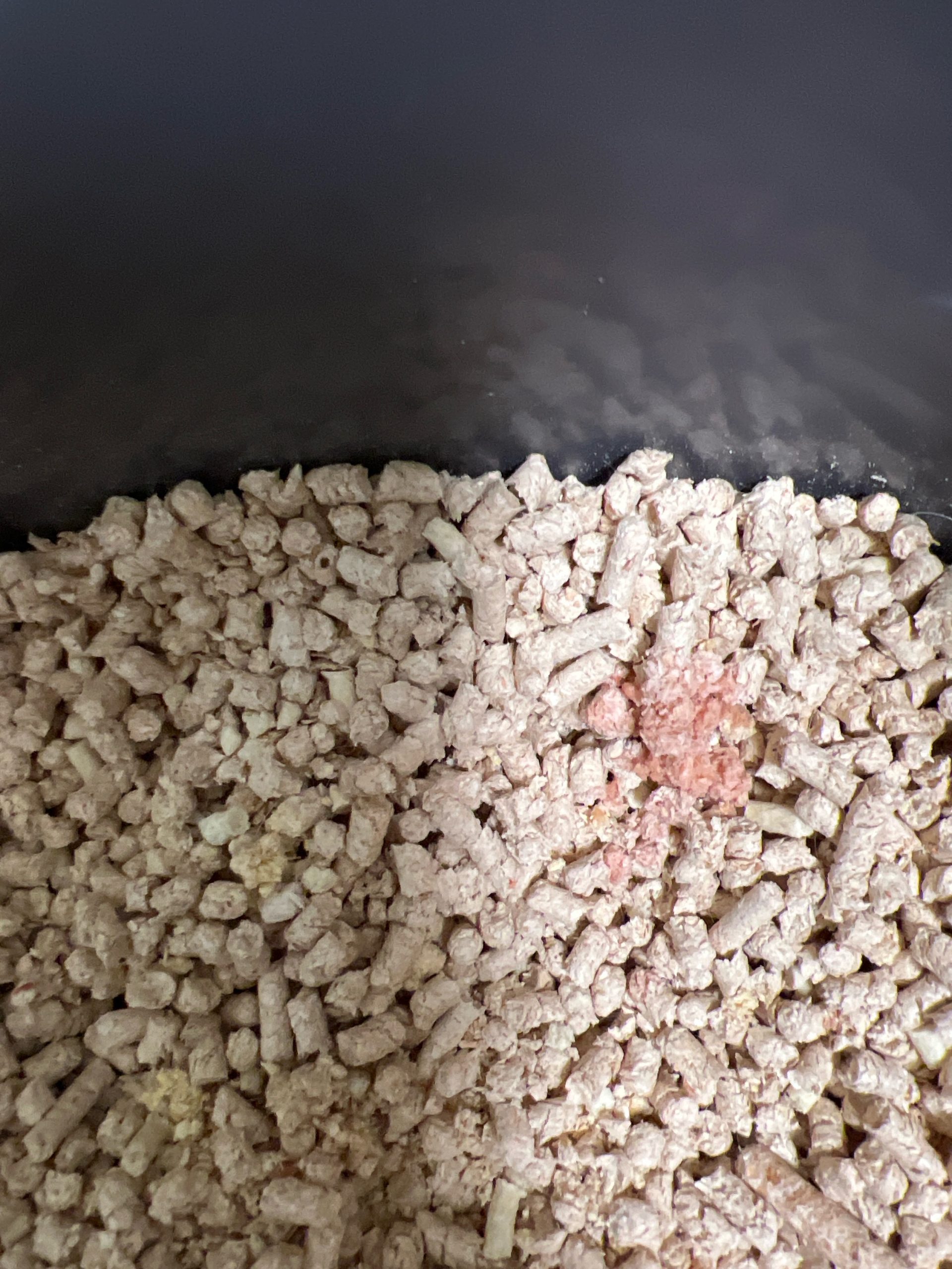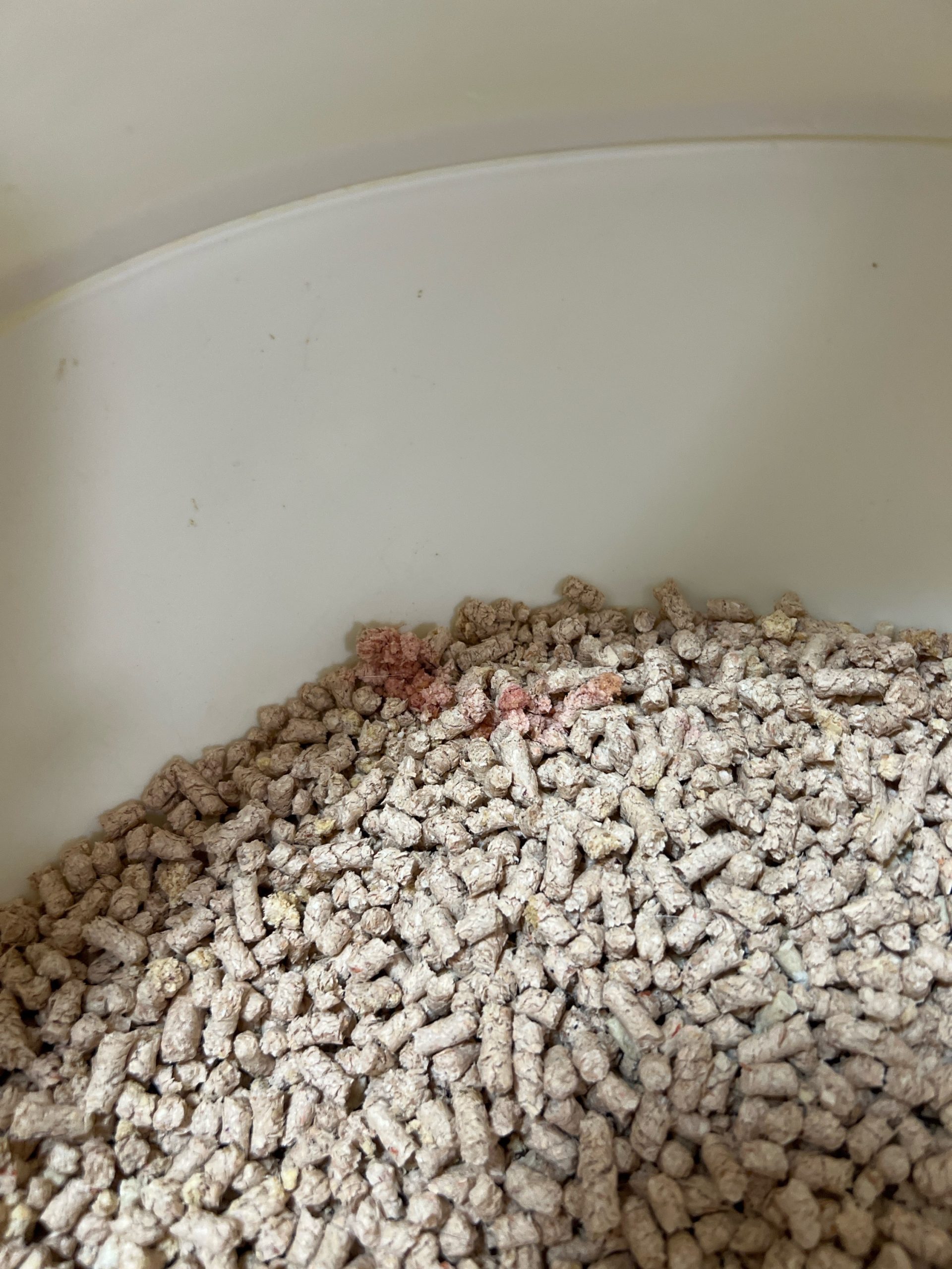 退室間際にレモン親子ケージにはみ出し便と赤い排尿あり