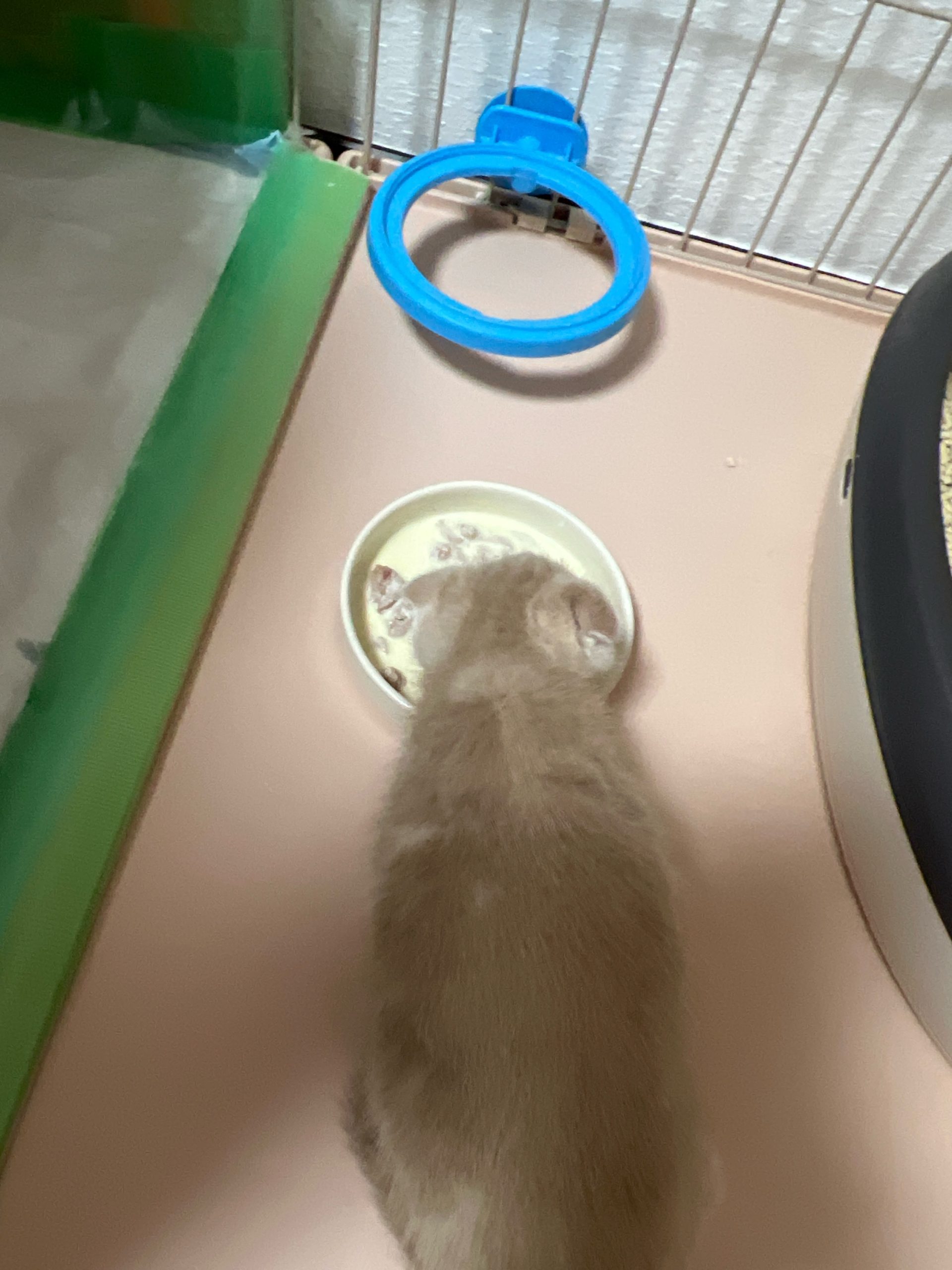 ウェットフードを自分でたべるように🍚まだ足が不安定なので最後はごはん皿に入りべたべたに🤣