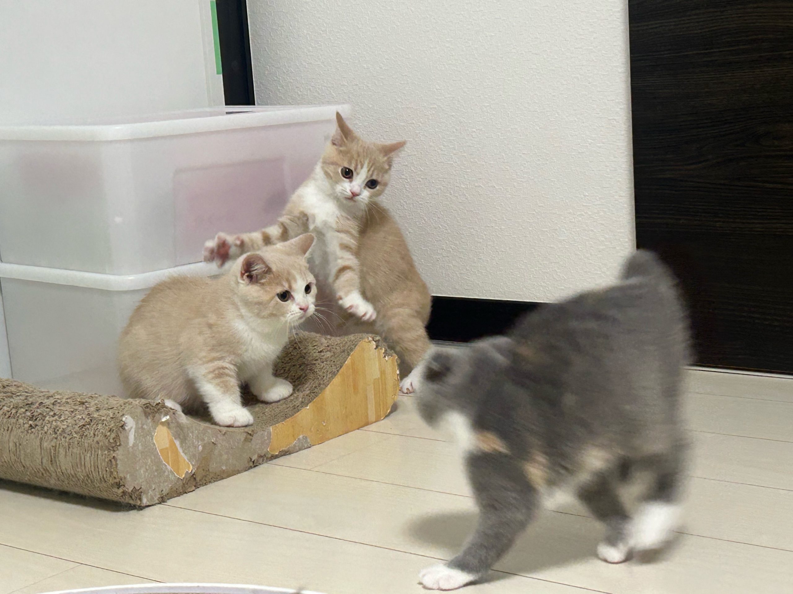 レモンちゃんのおトイレ掃除でレモンちゃんと3.4ちゃんを出した際に3匹がそろってお水をのみに猛ダッシュ。