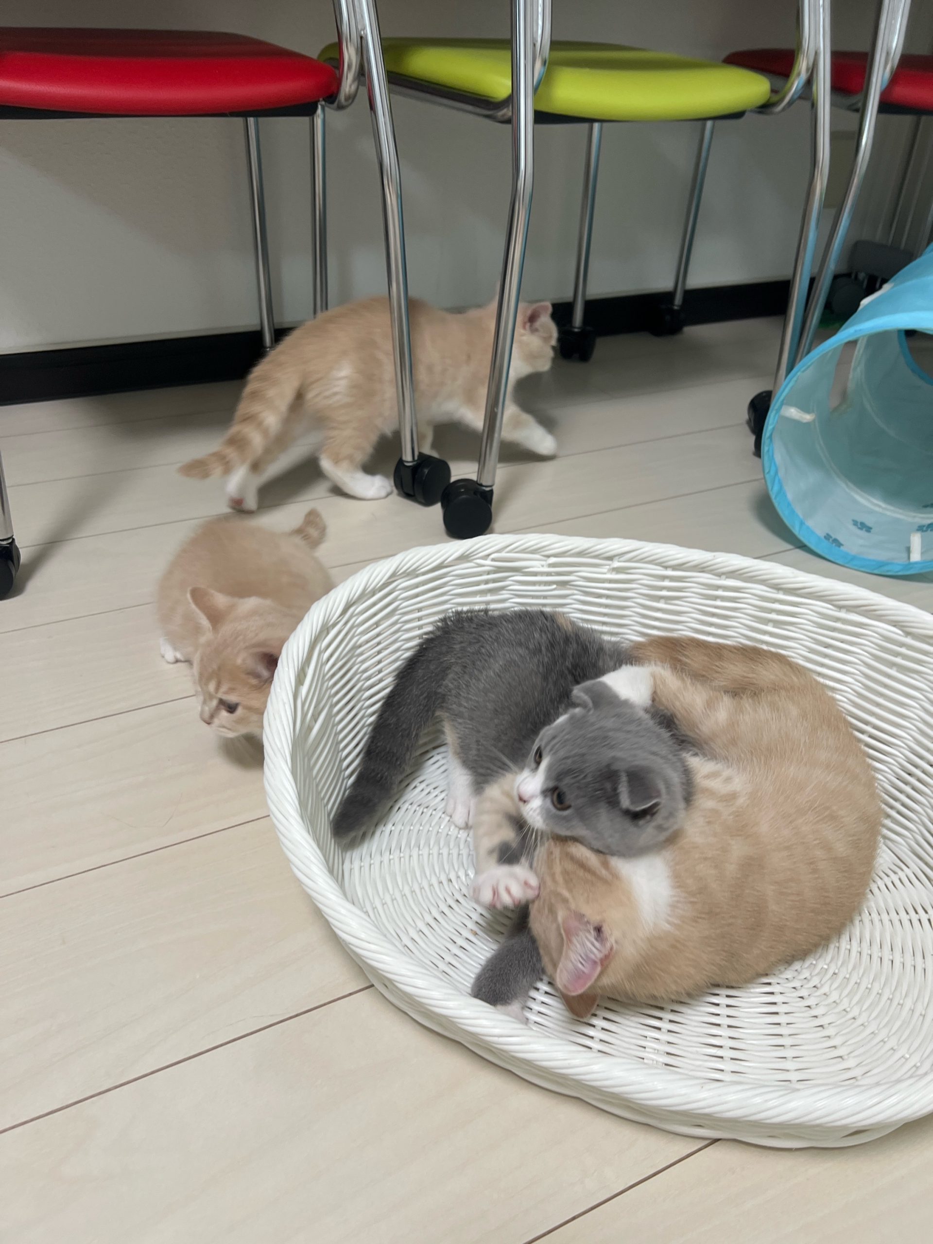 レモンちゃんと赤ちゃんたちはまた目の届く時間だけ放牧。その後1.2ちゃんはレモンケージに、3.4ちゃん小ケージにいます。