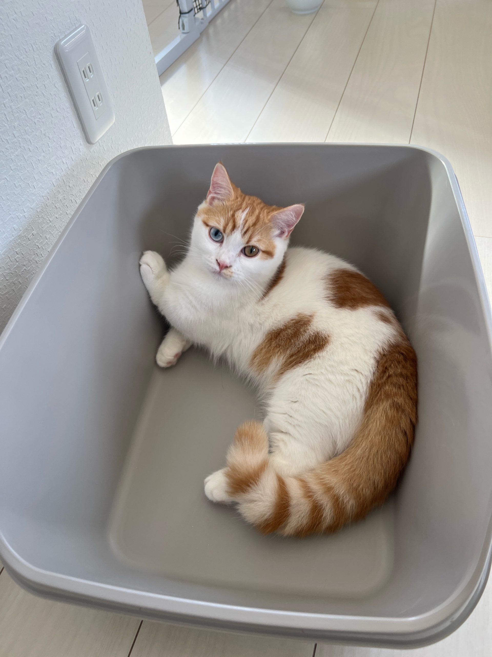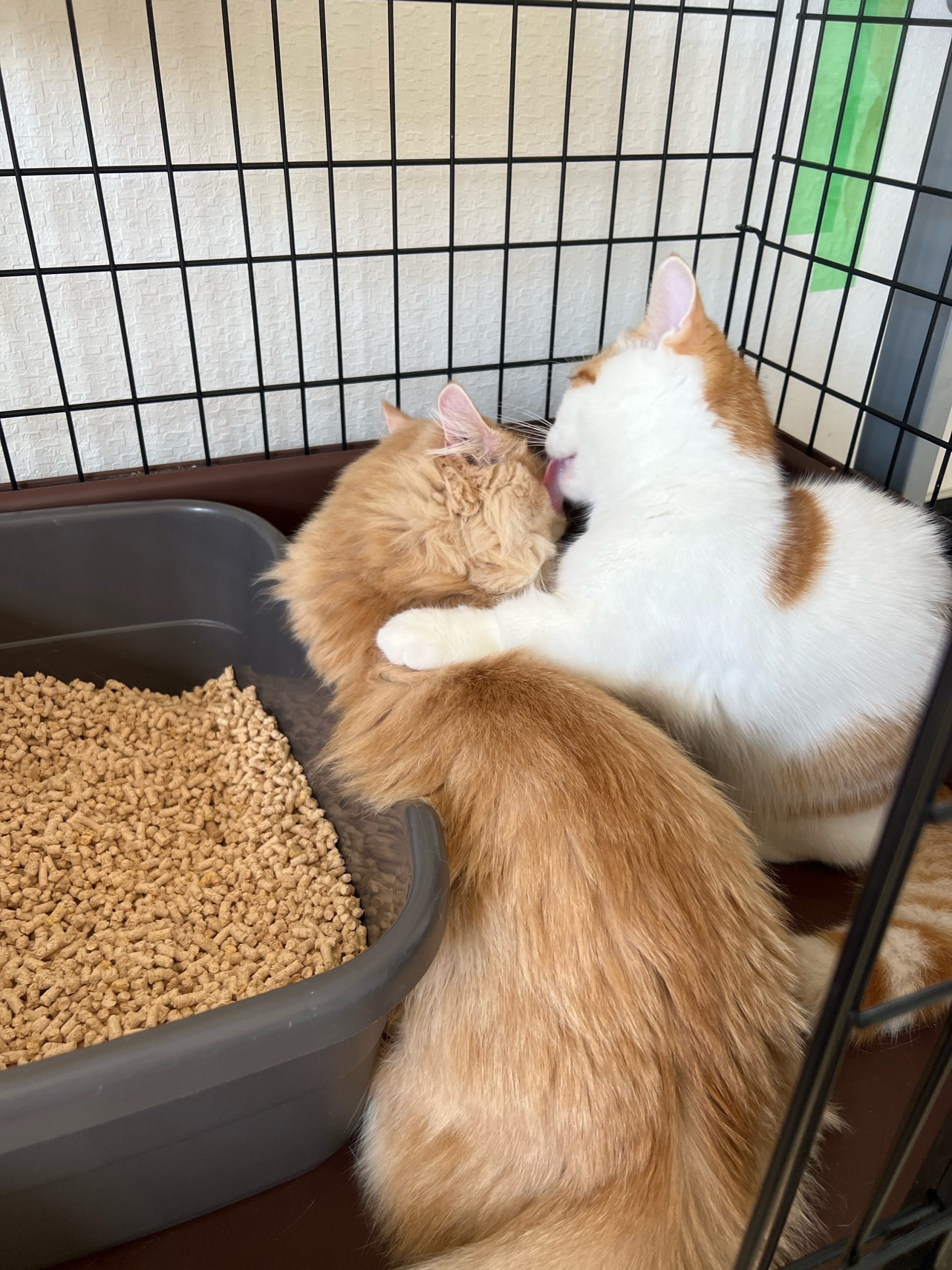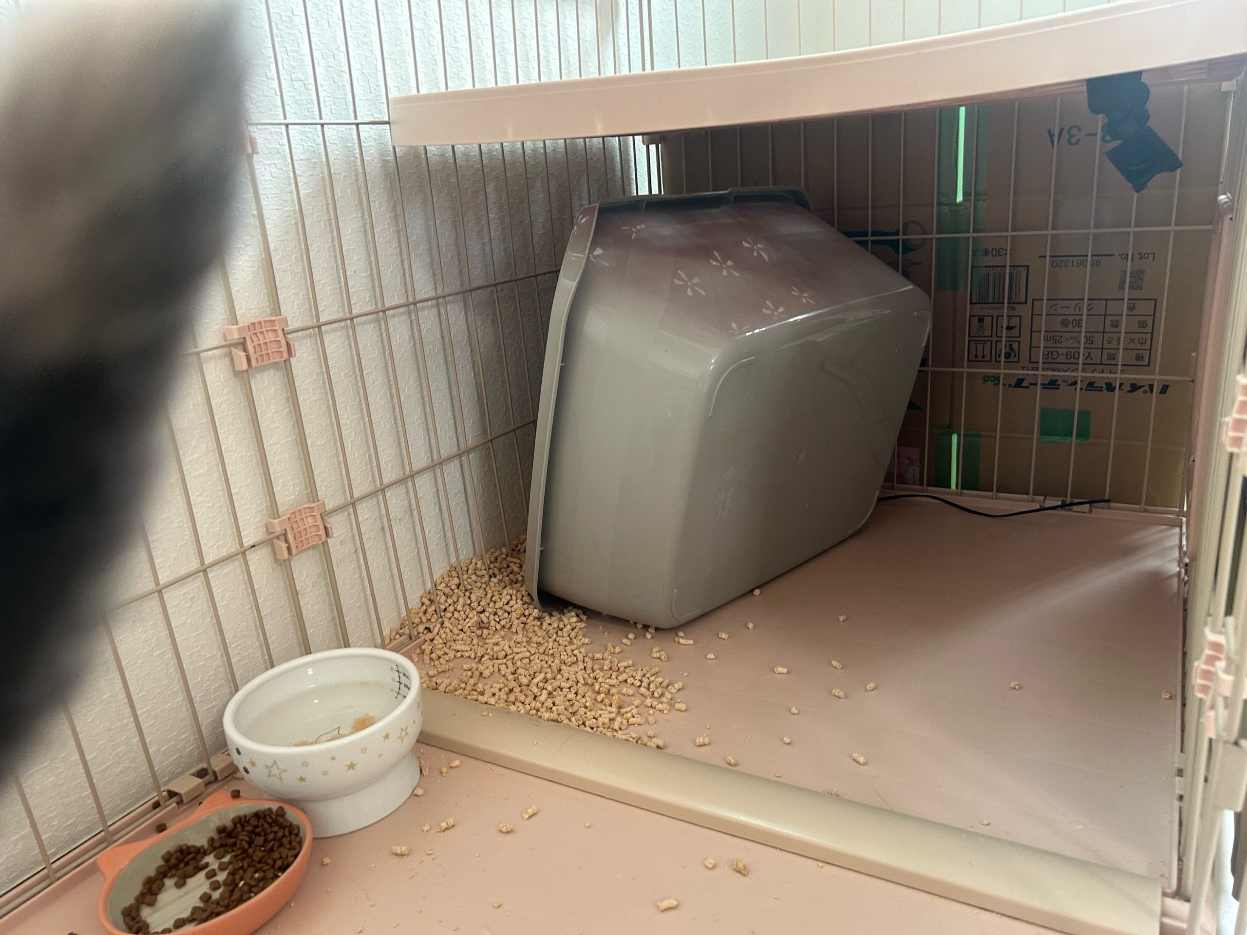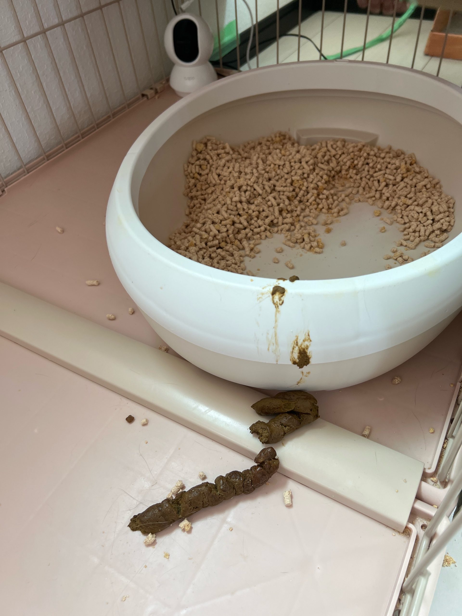 レモン親子ケージ内の大きなおトイレ容器は、レモンちゃんがひっくり返してしまうため放牧組と交代しました🚽