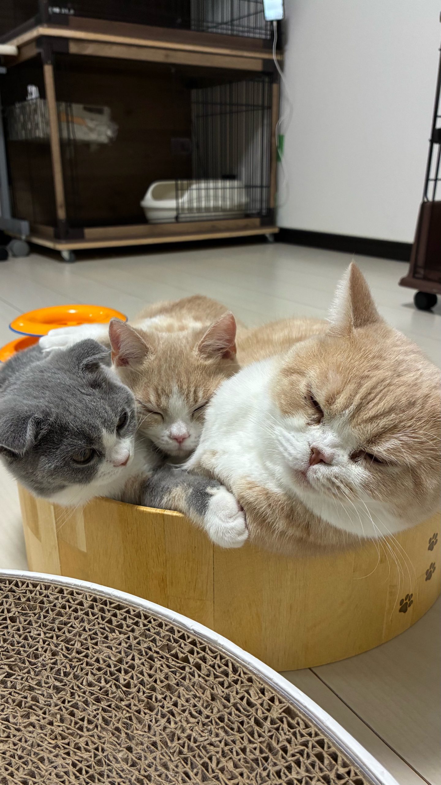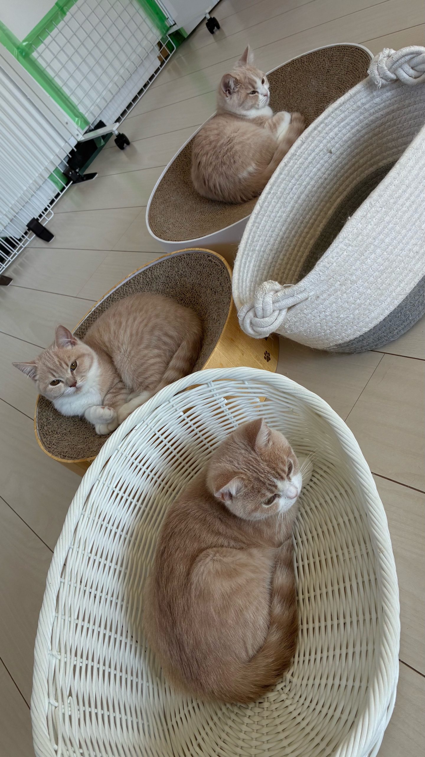 猫砂到着、一箱ずつ各階にあります。(親子部屋とオス部屋には開けて分けてあります。)
