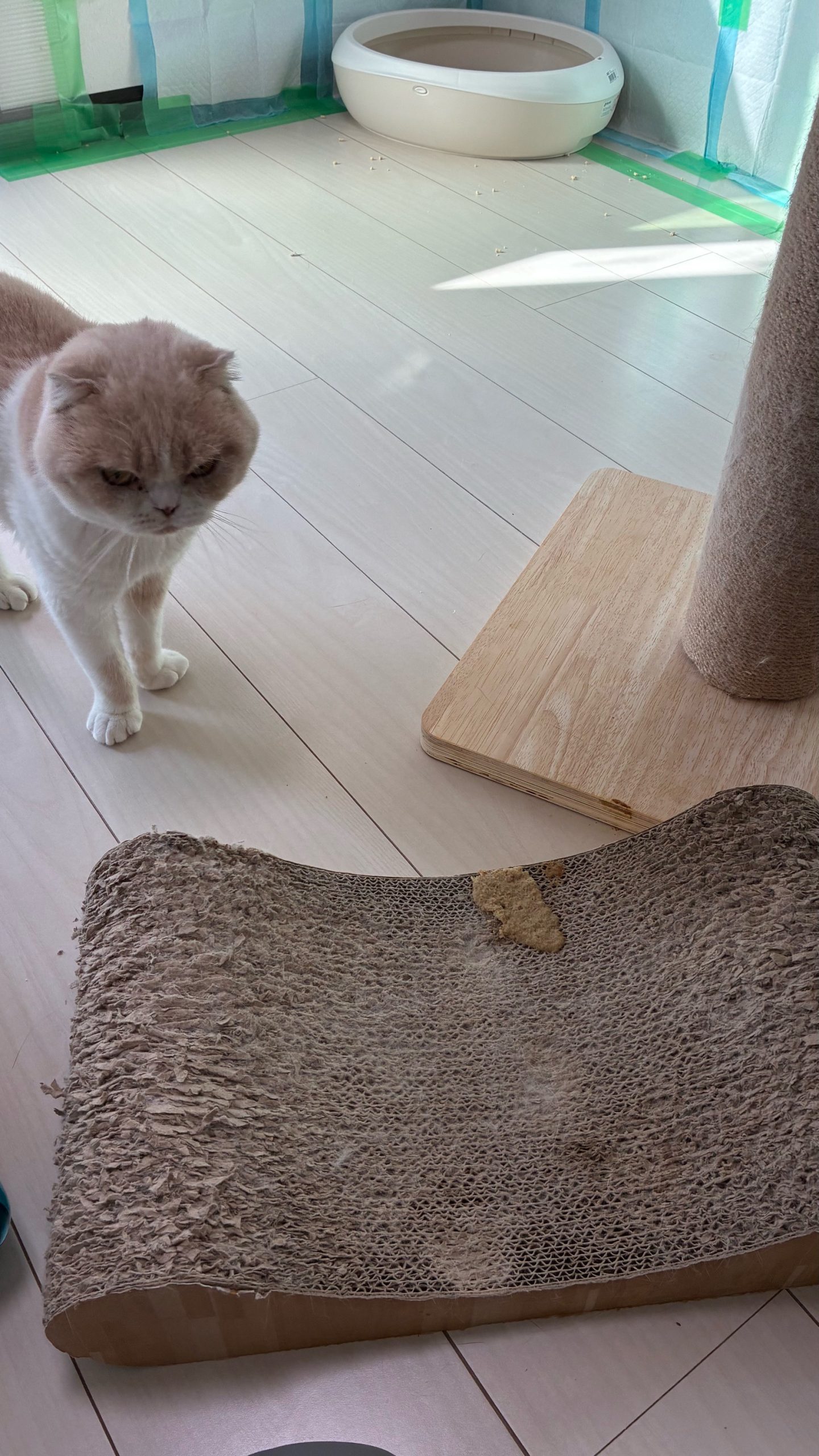 オス部屋の爪研ぎに嘔吐ありだったので拭き取り、消毒スプレーでお日さまの当たるところで乾かしましたが隙間にはいっていそうなので破棄するか、確認お願いします🙇