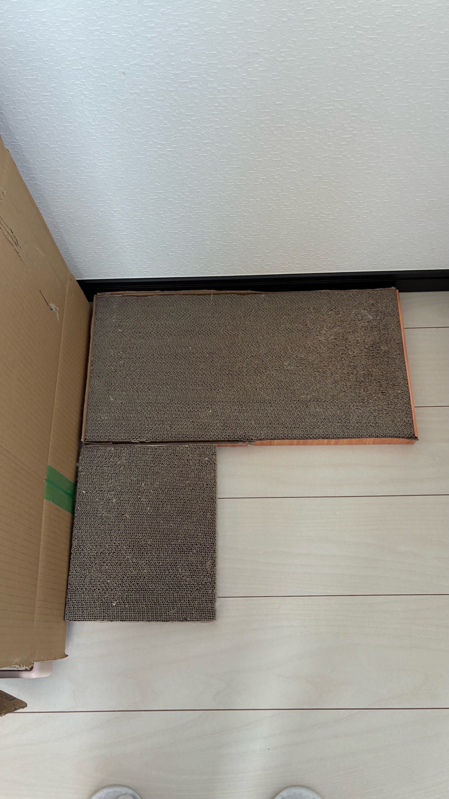 昨日2階の組み立て爪研ぎのダンボール片がひどかったのでまわりを切り取りました。