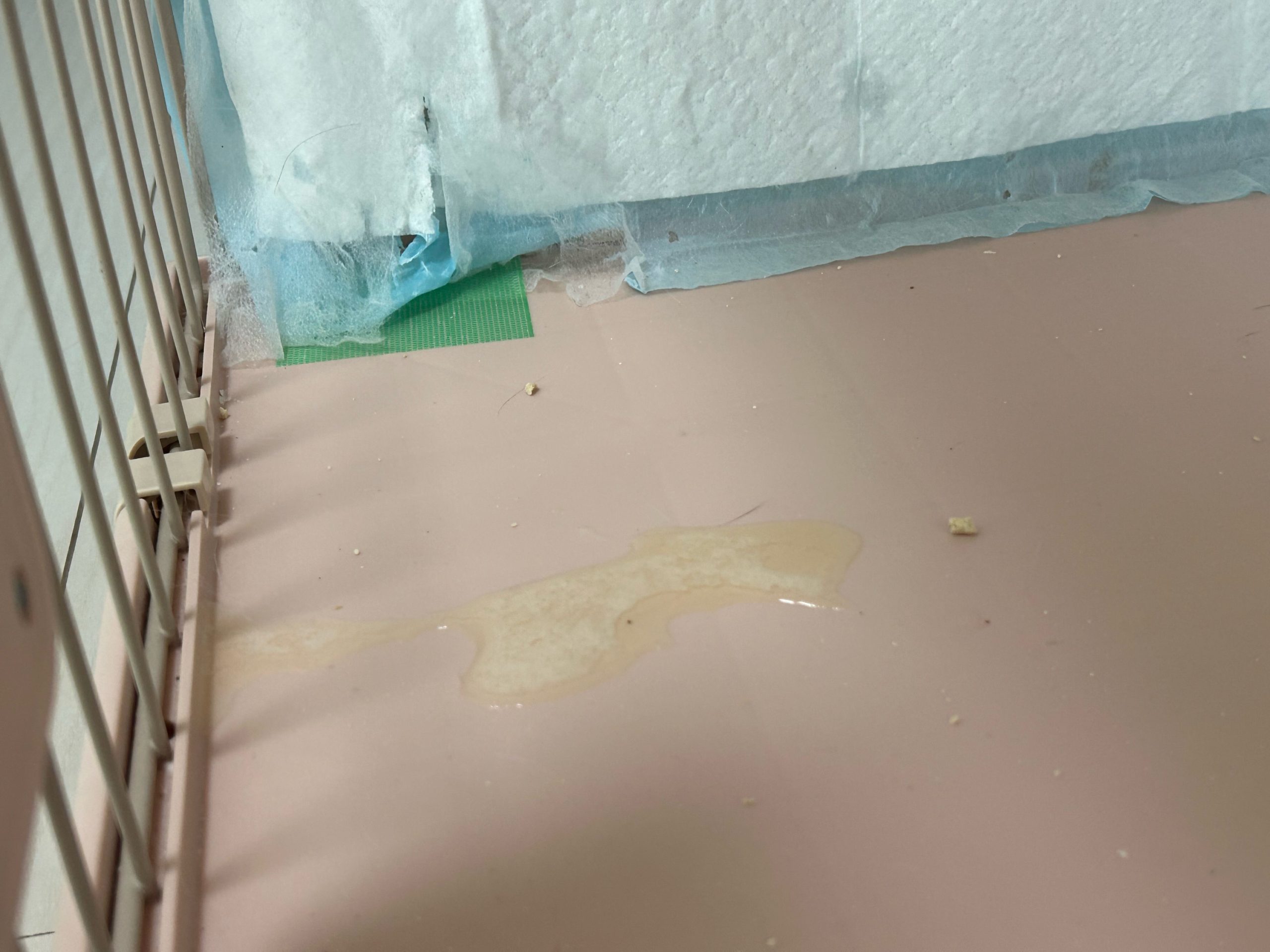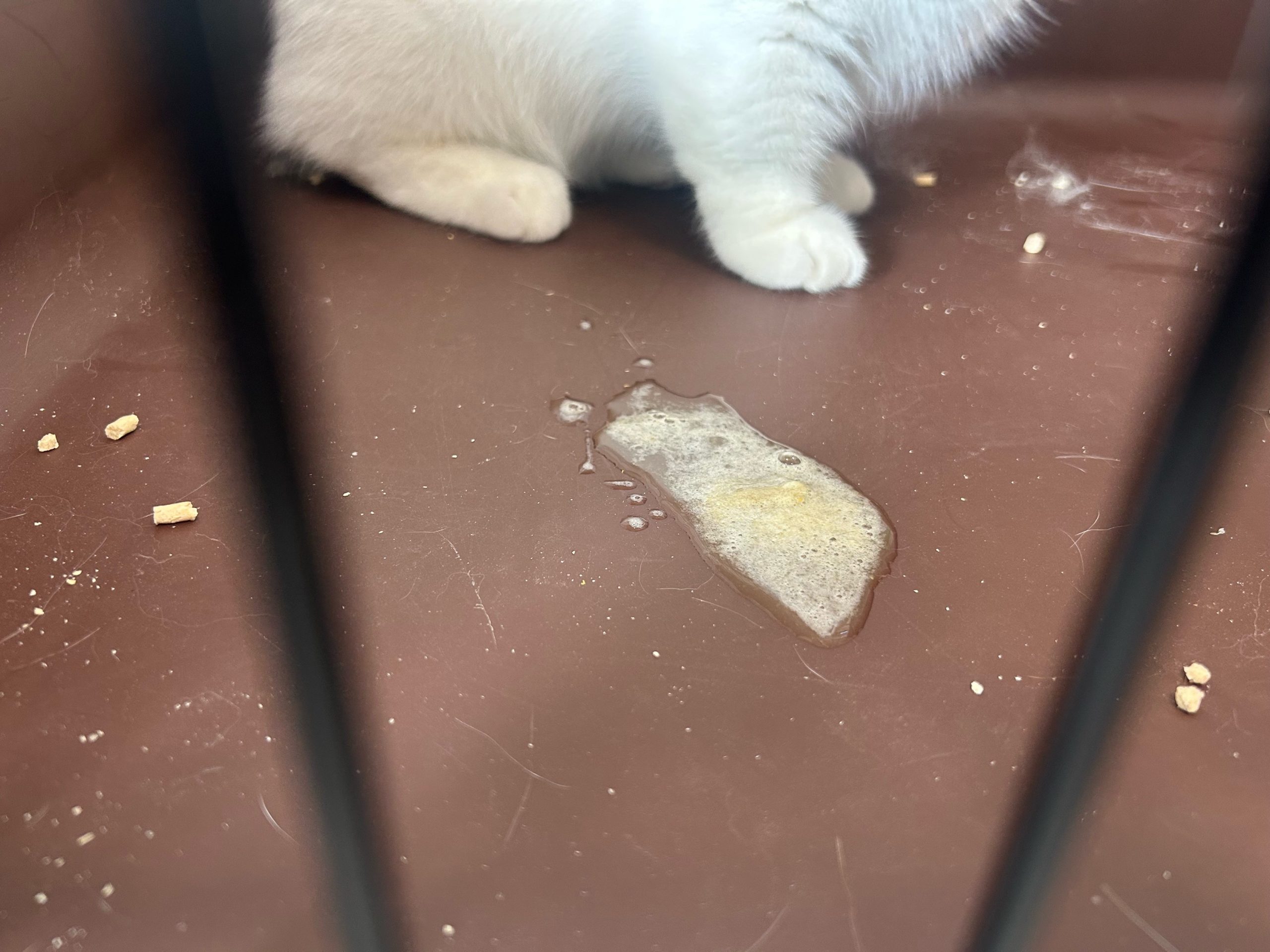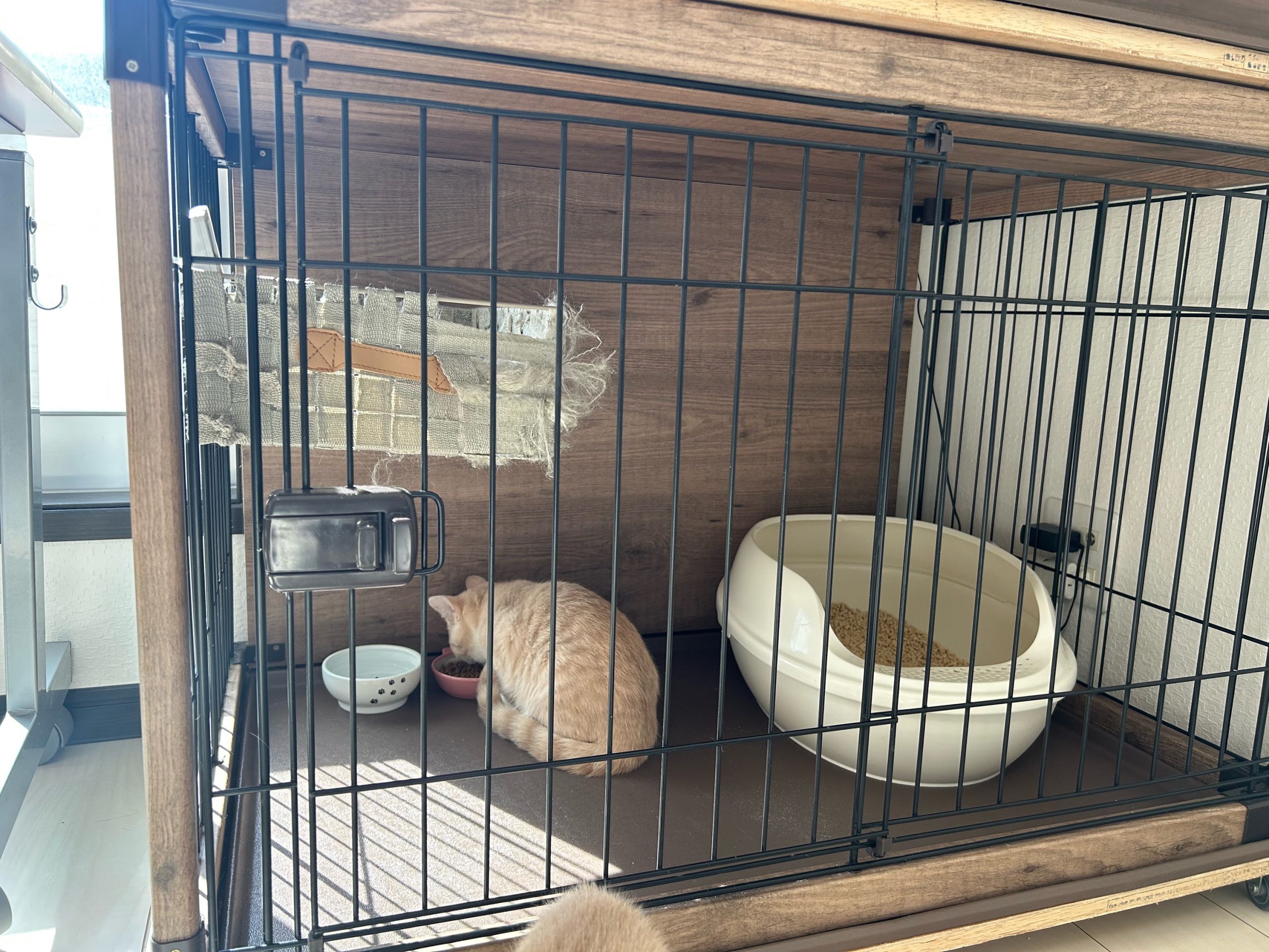 うんち採取のため、ミュウくんは小ケージ下で過ごしてもらっています🏠🐱