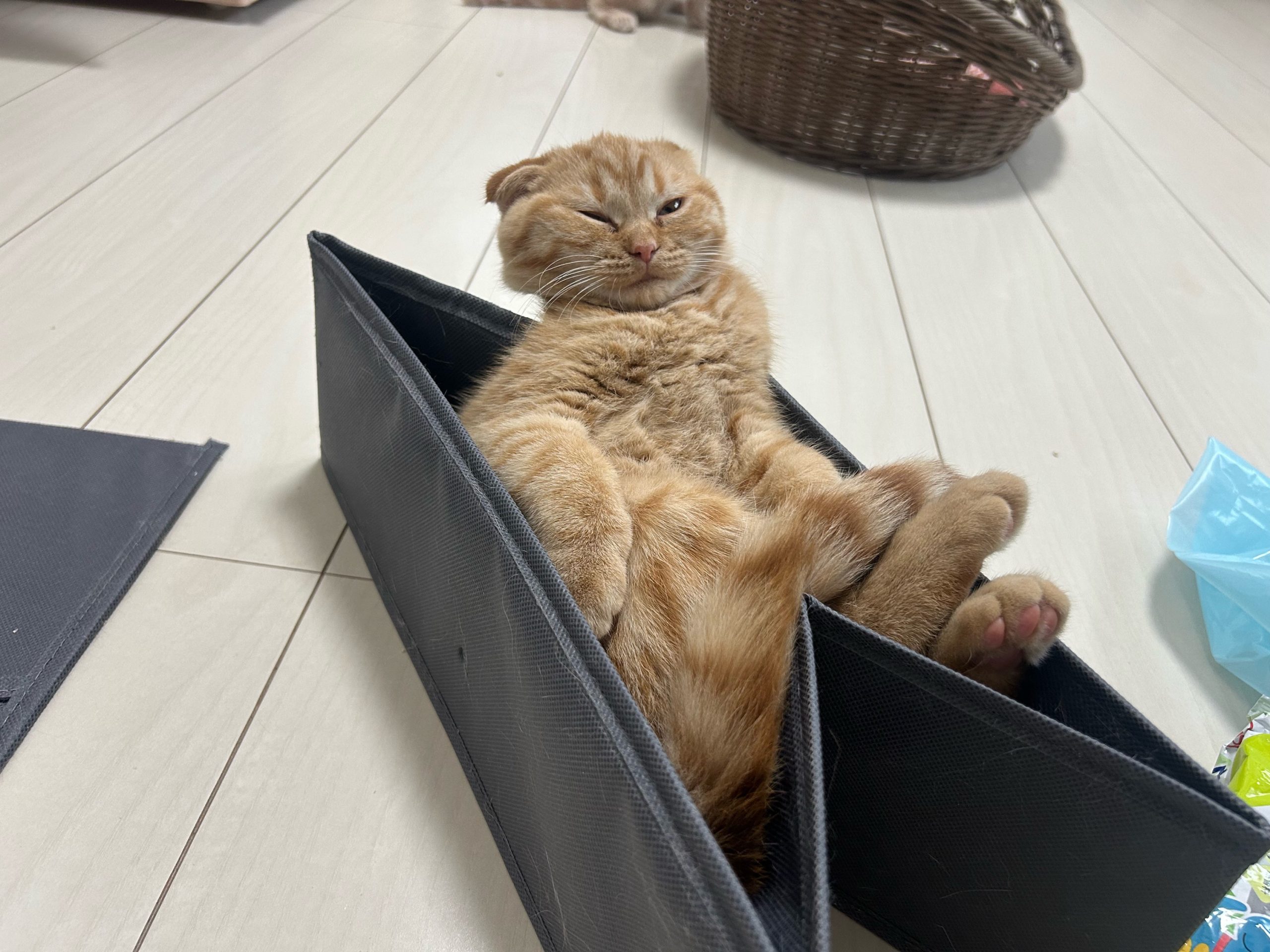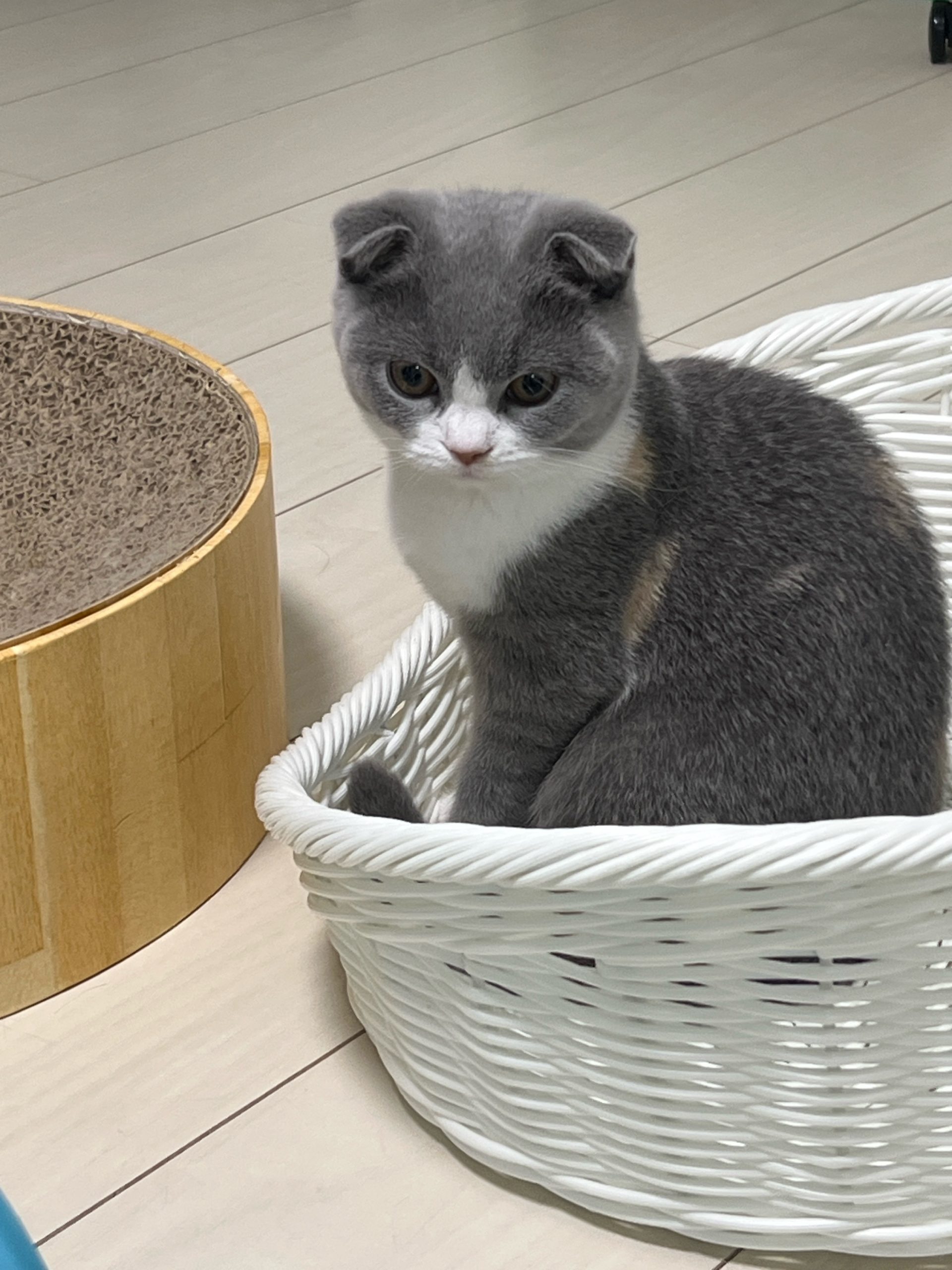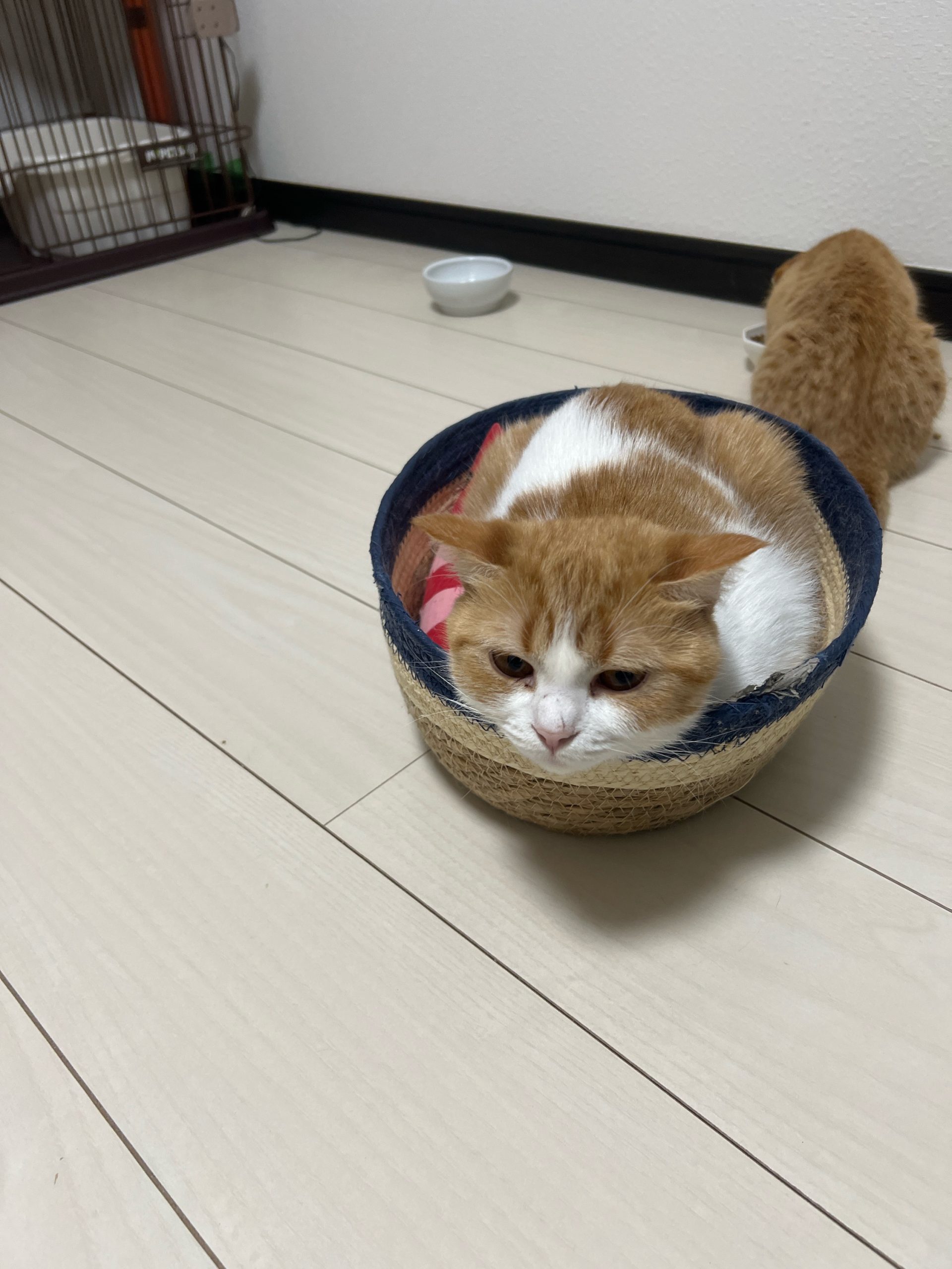 黒いカゴが底部分を解体されてひっくり返されており、ロコ赤ちゃんの長女ちゃんが優雅にくつろいでおりました🍵