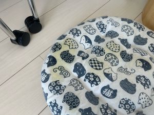 猫柄の座布団が少し湿っぽいので洗面所に干してあります