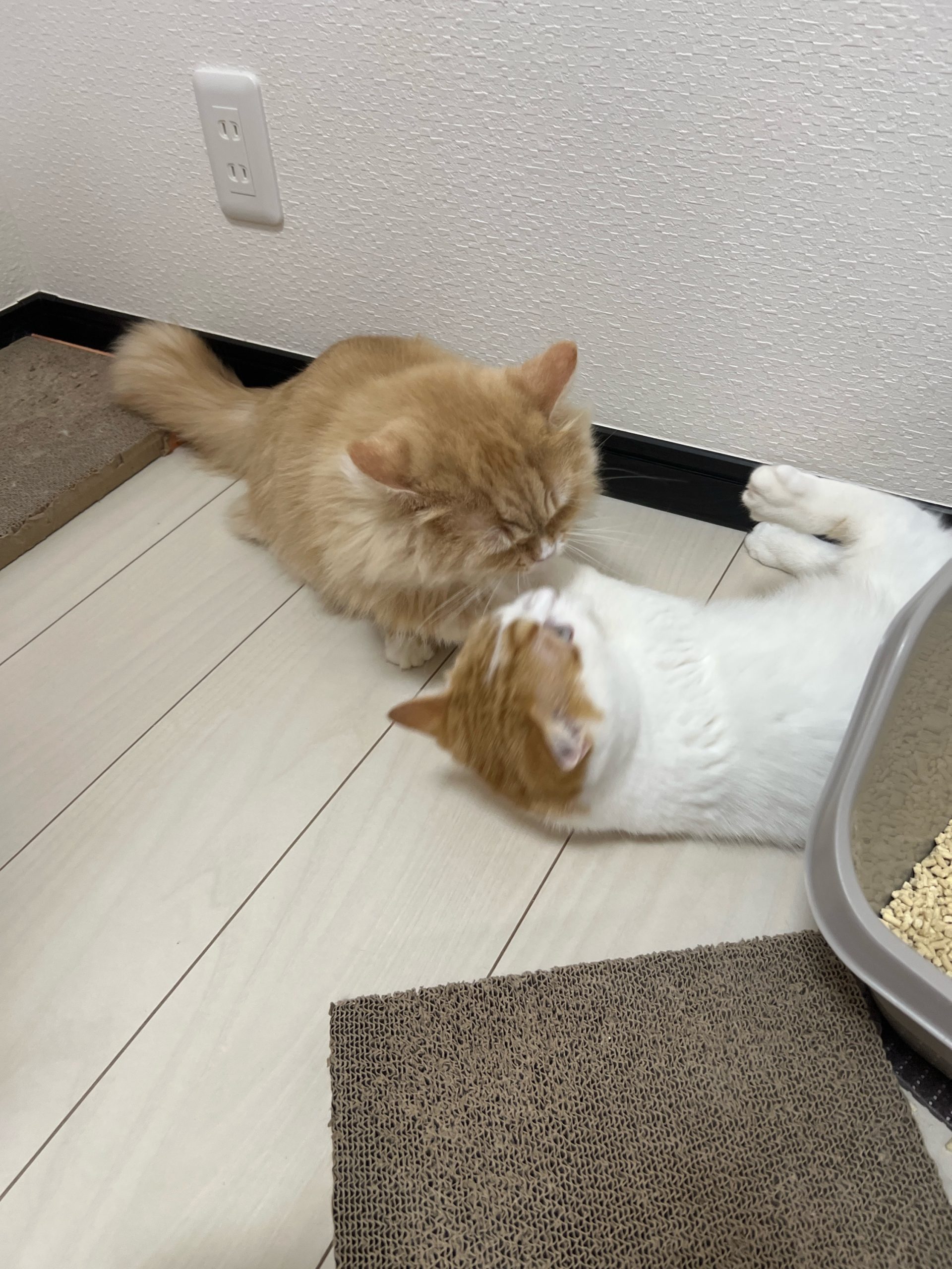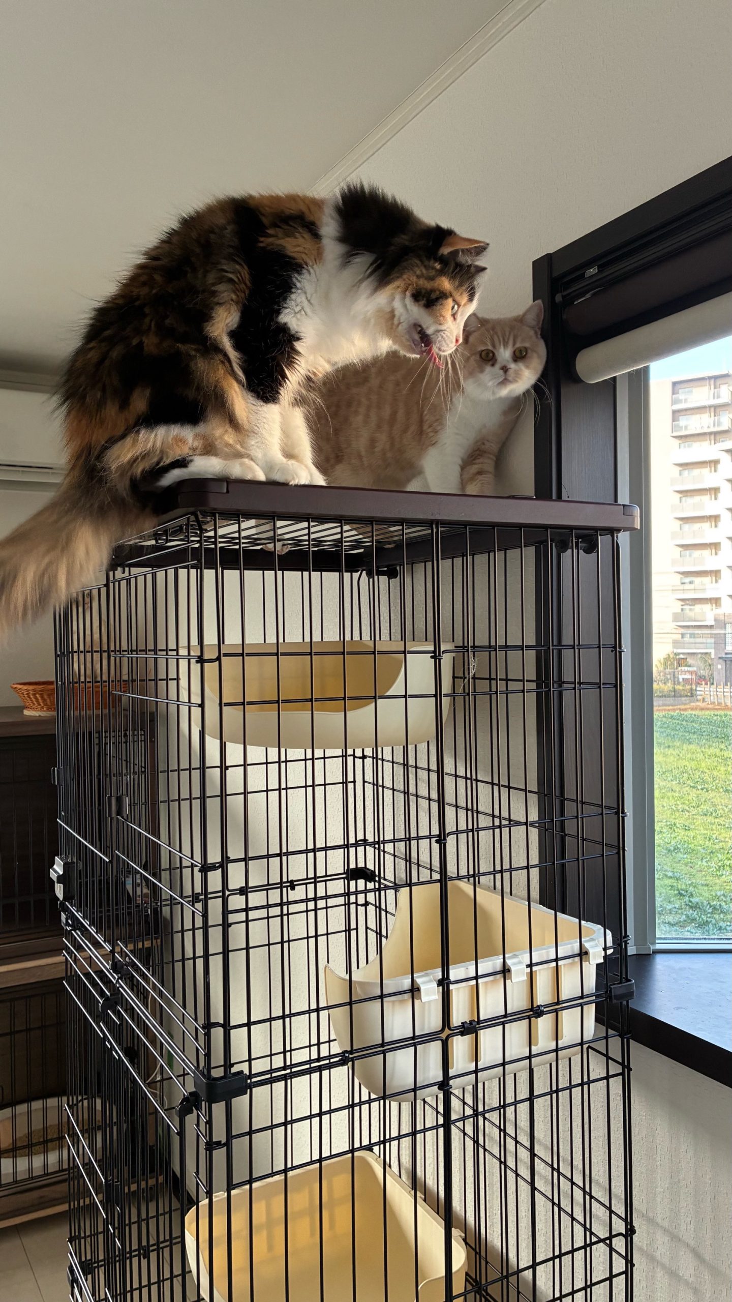 毛が舞うほどのおこめちゃんvsロコちゃん、すぐにおこめちゃんをゲージ内に移動。