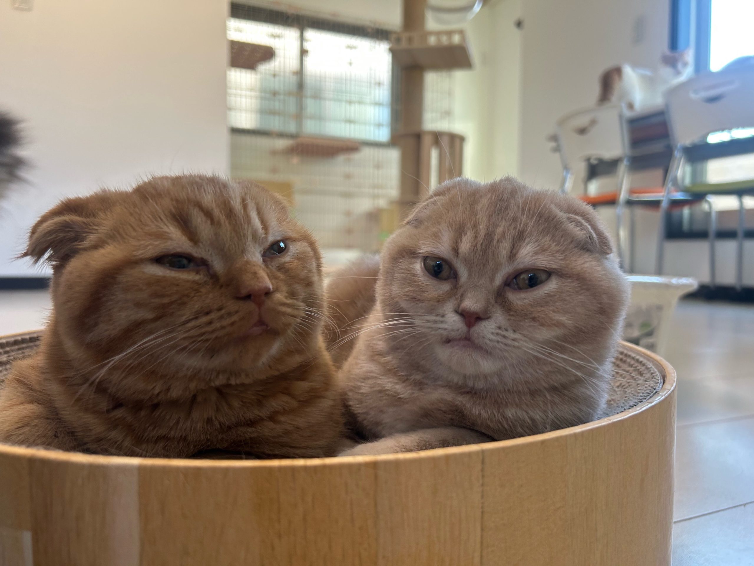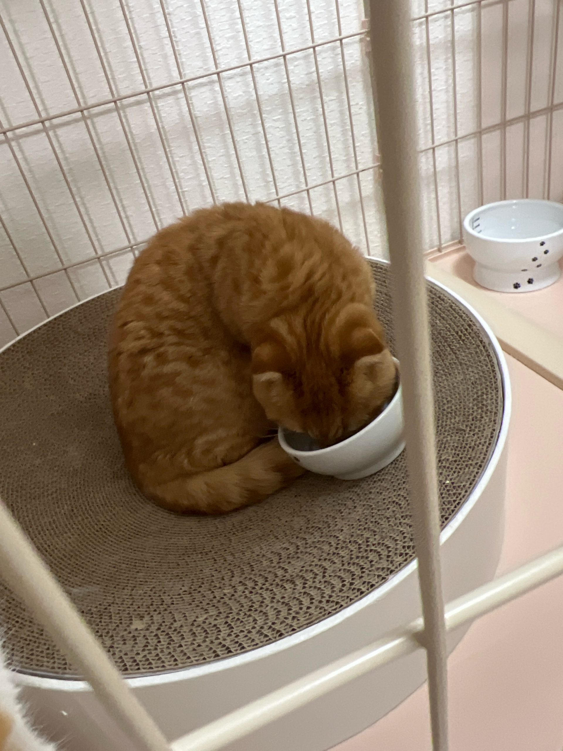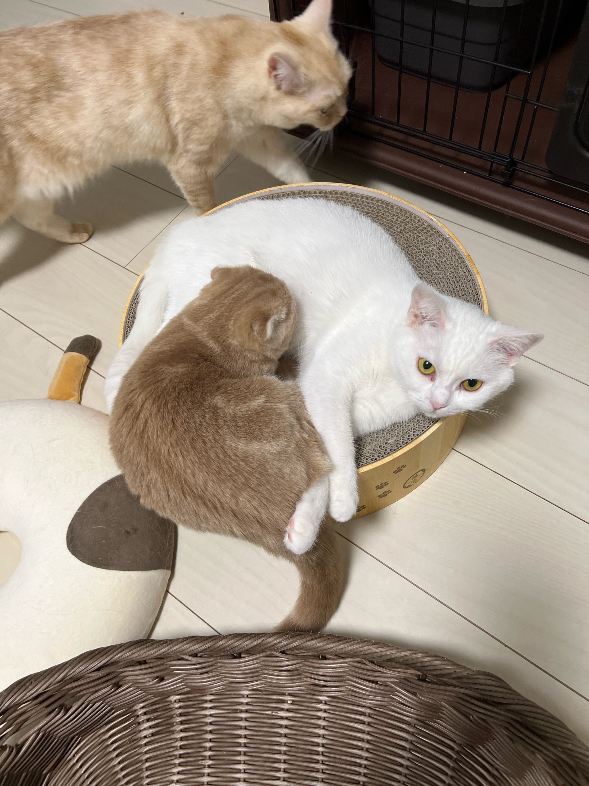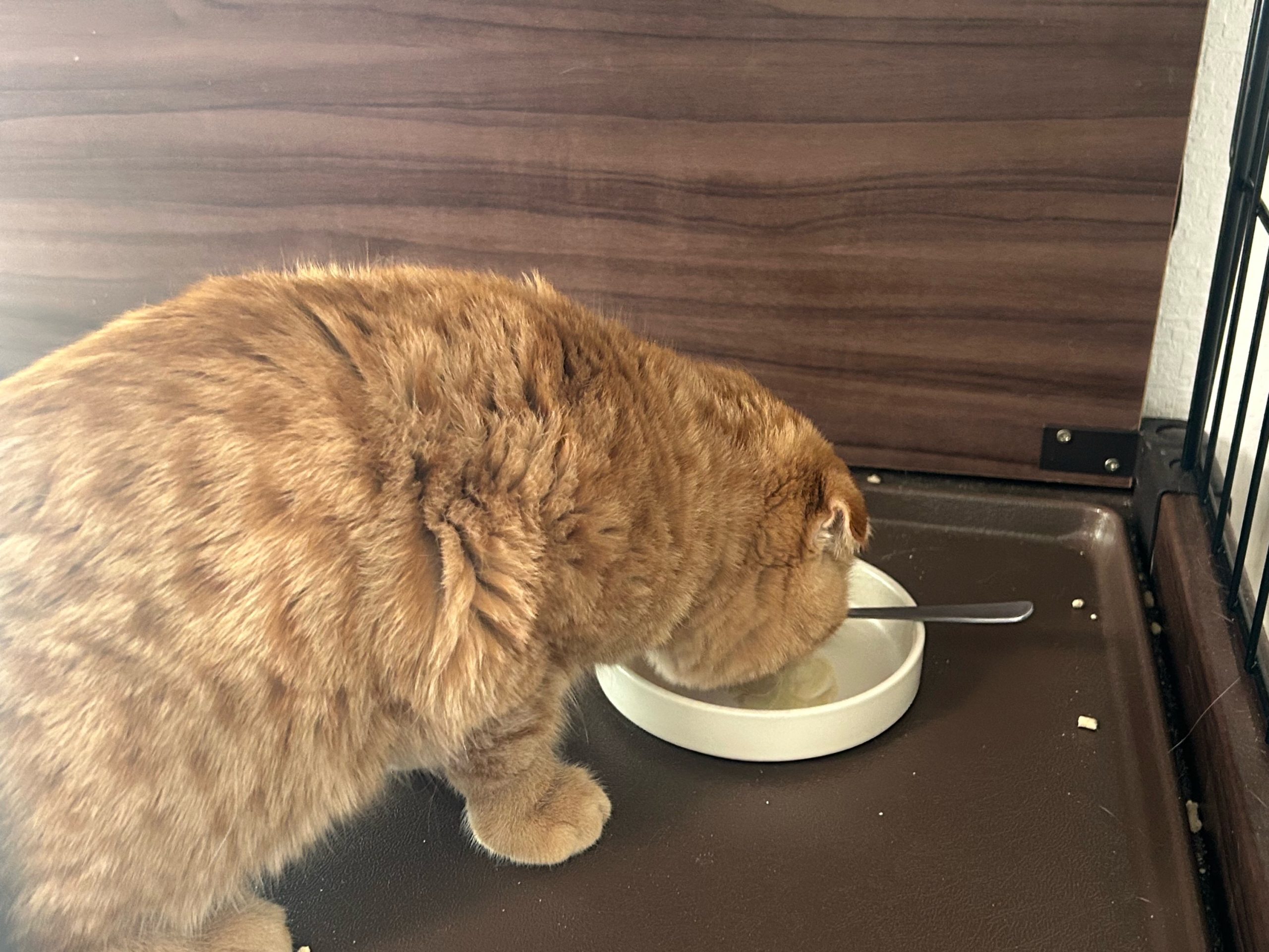 退室間際に2ちゃんだけ爪とぎにいたので総合栄養食のチュールを半分くらい食べ、残りを3ちゃんが食べていました