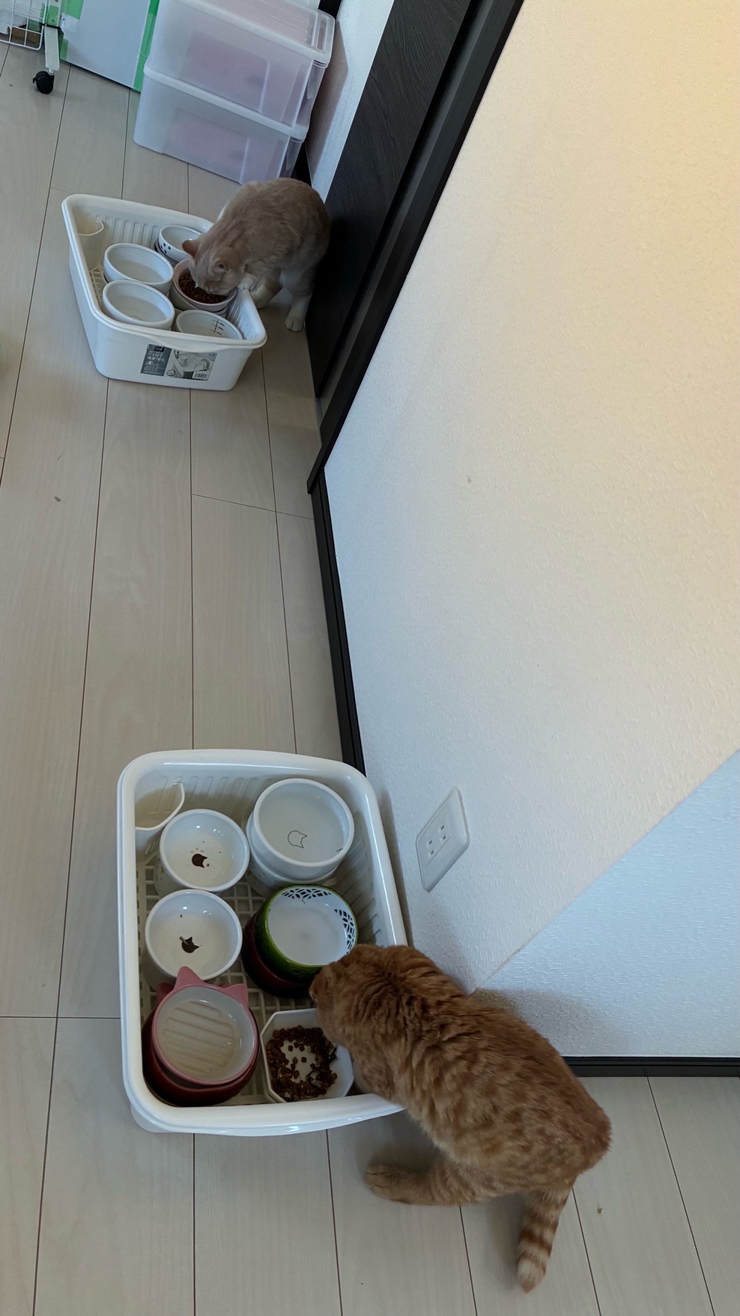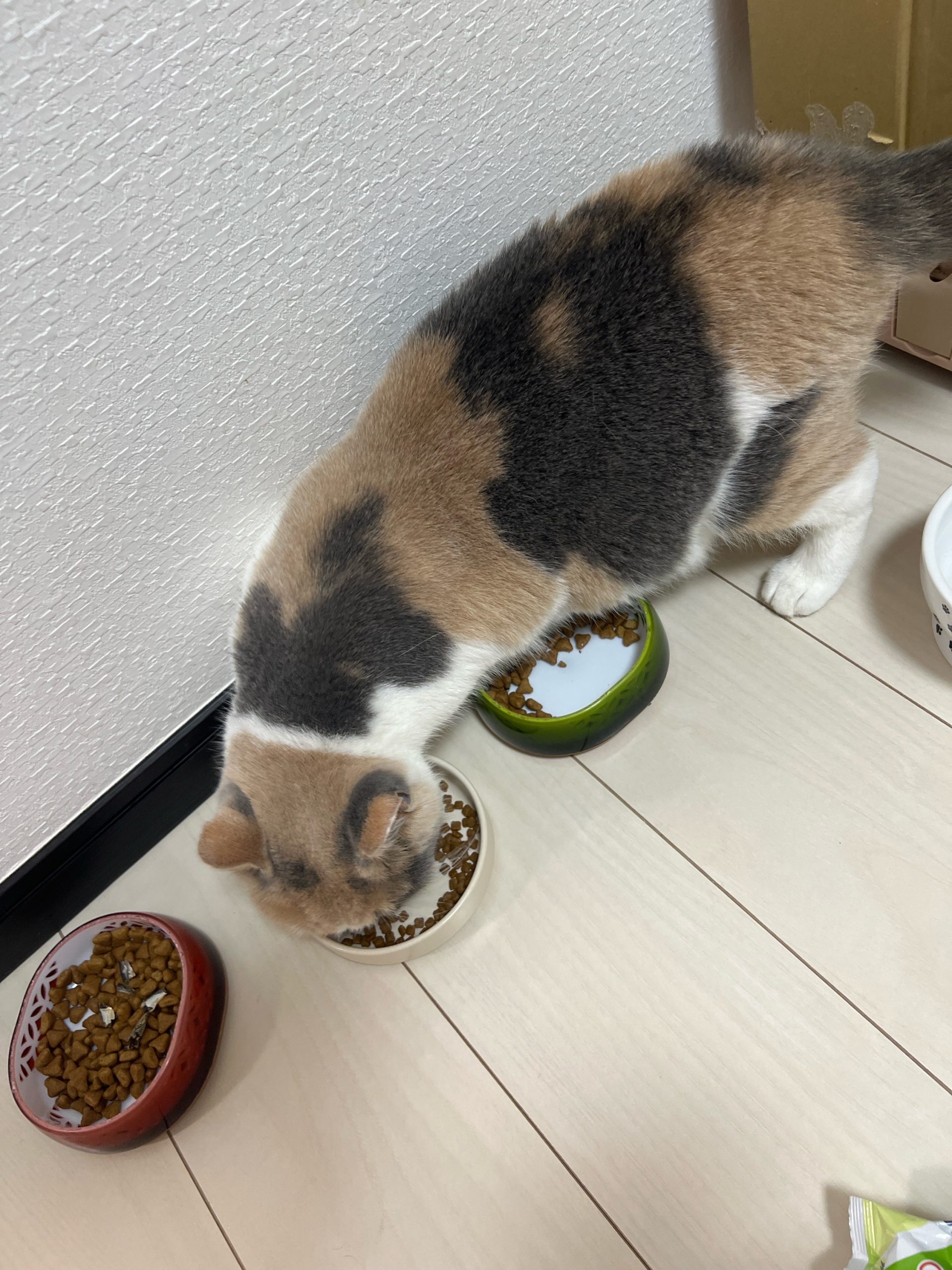 レモンちゃんは成猫用ご飯を残しがちでケージを出るとすぐに赤ちゃんご飯を食べ始めました