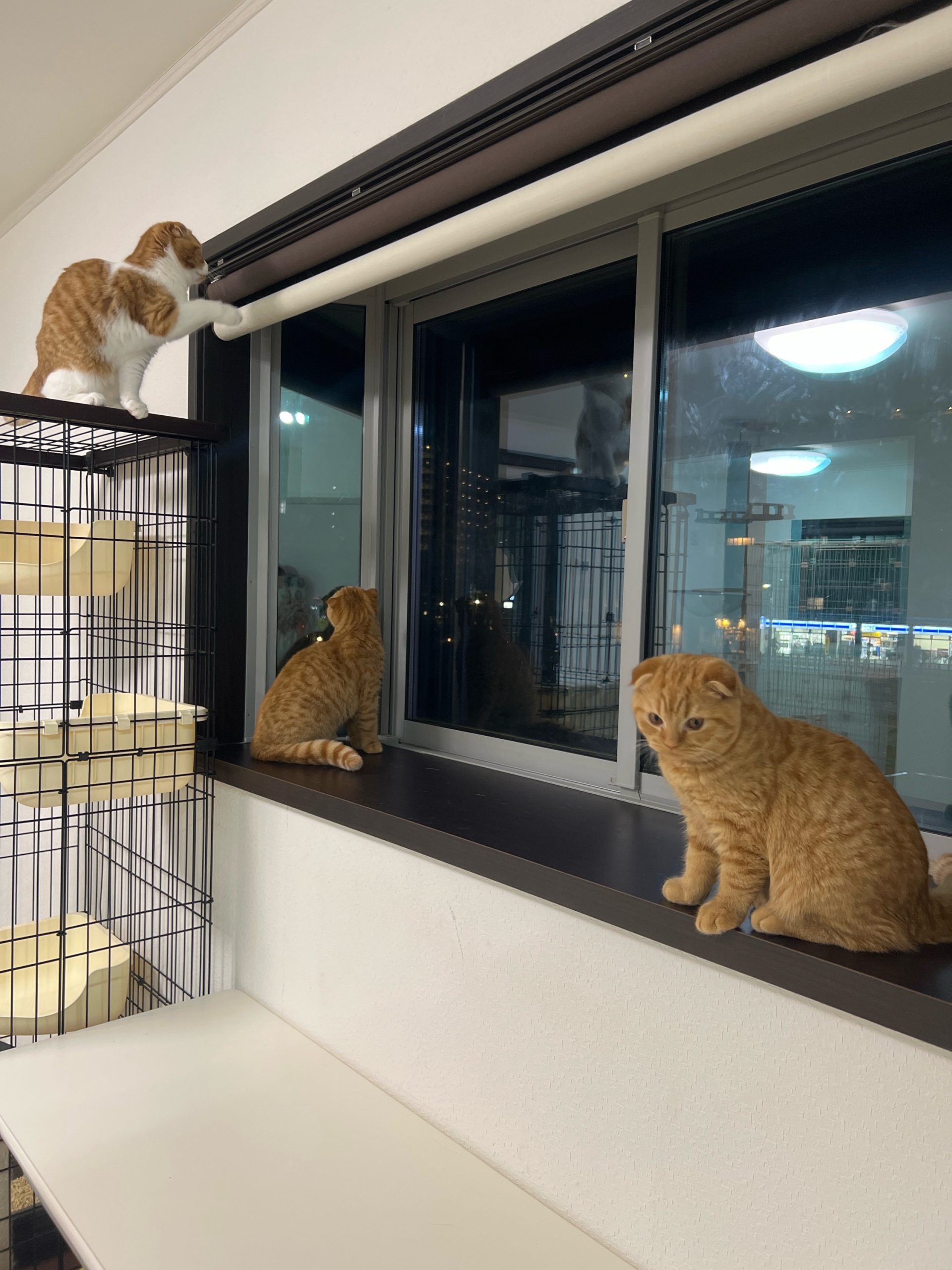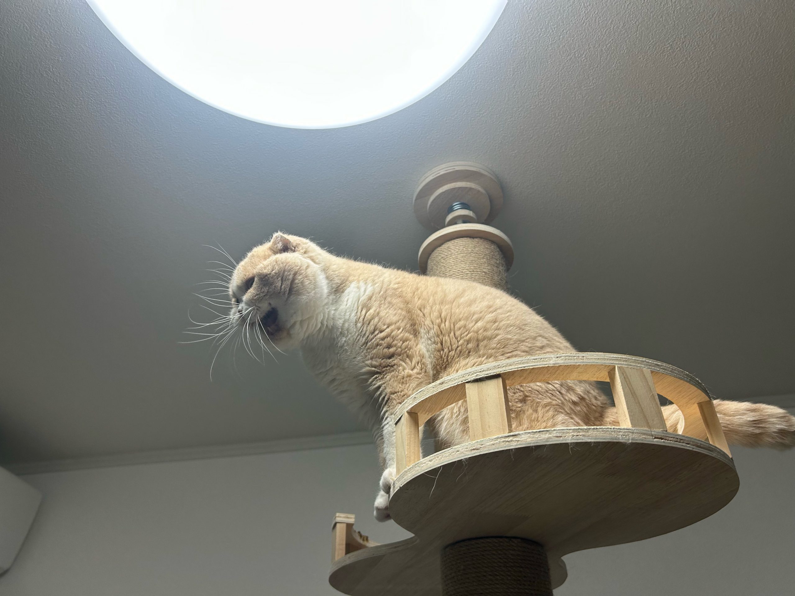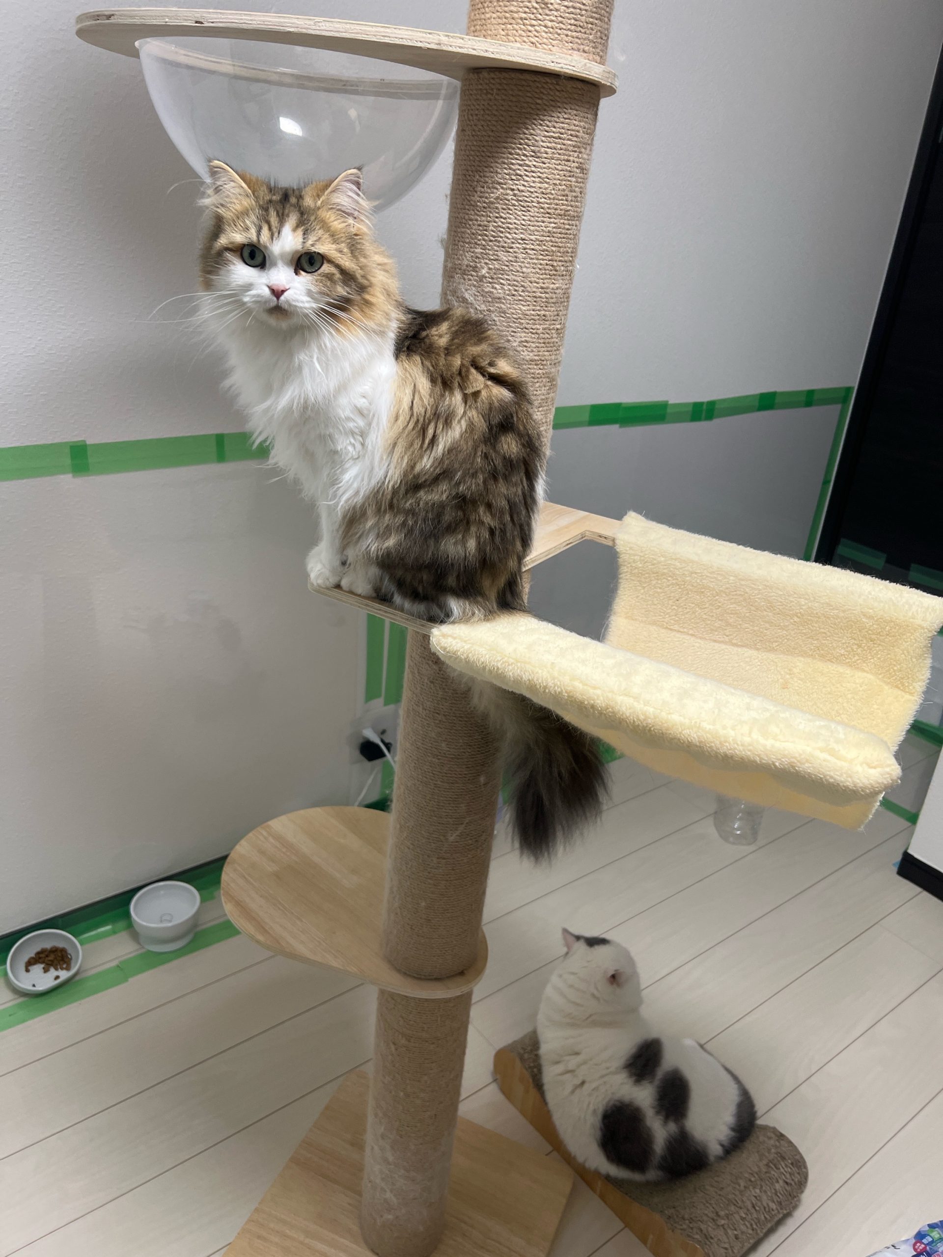 また、なぜかまるくんも自力じゃ降りられない〜💦と、キャットタワー最上段にいらっしゃいました🐱