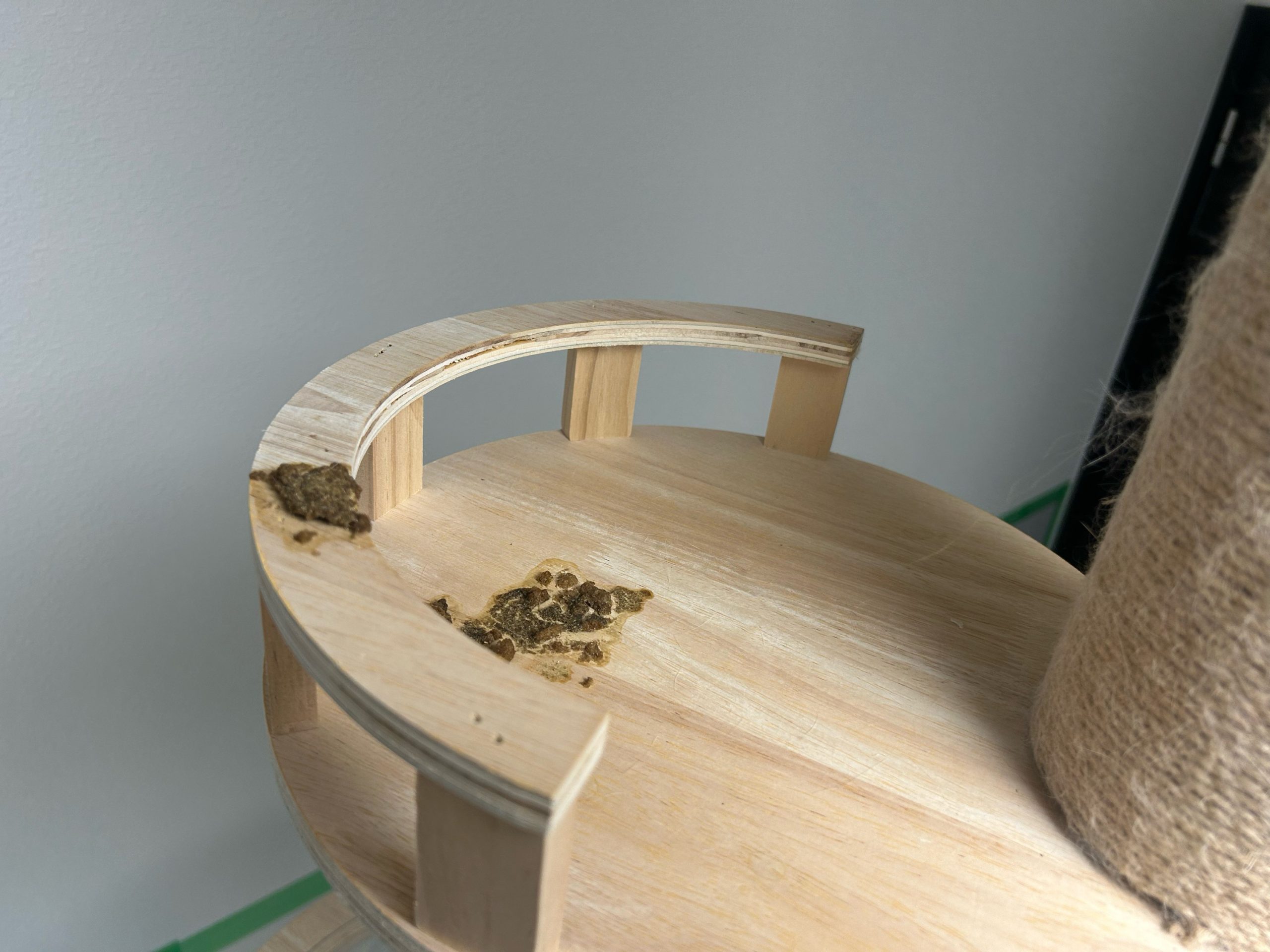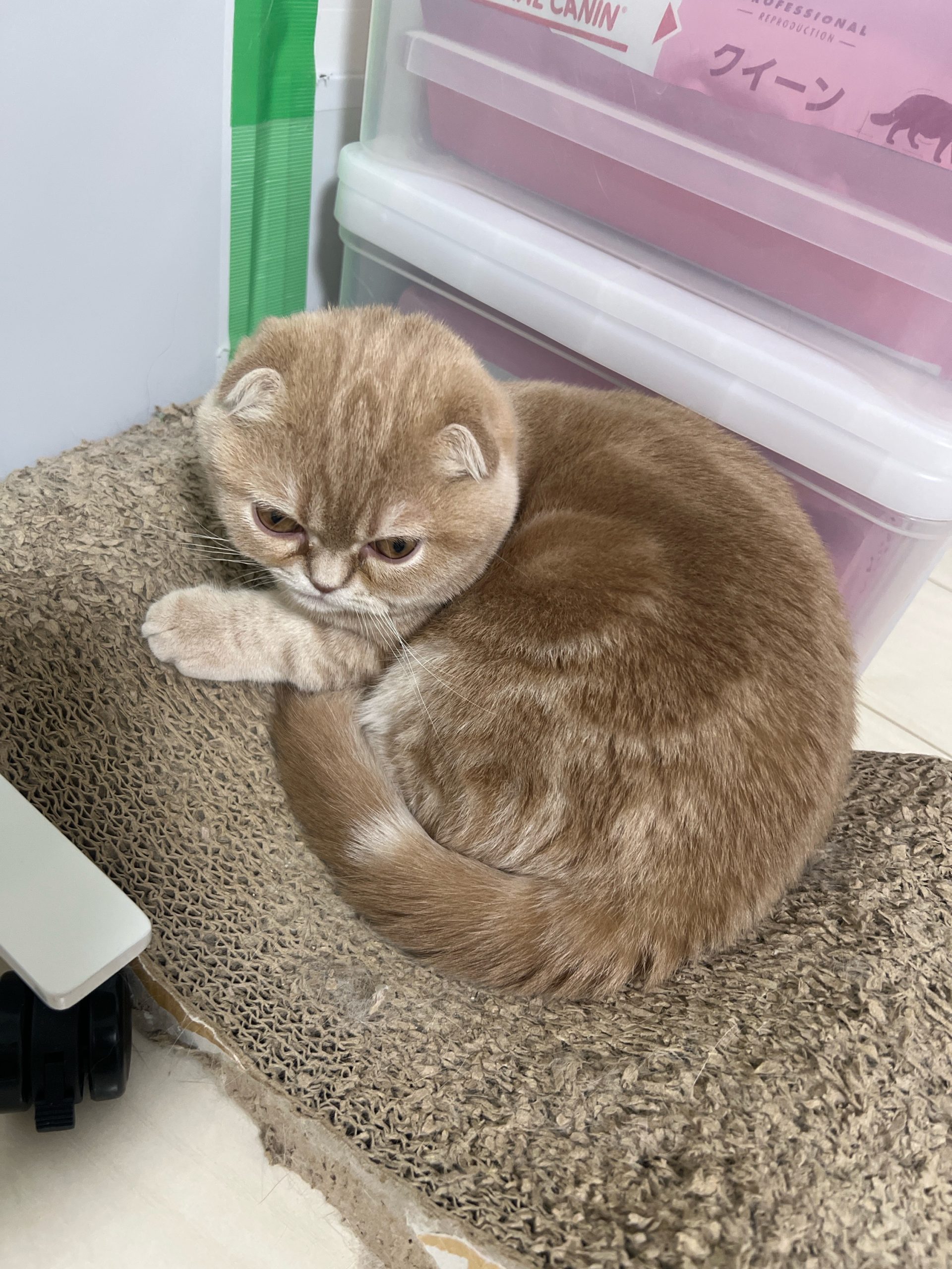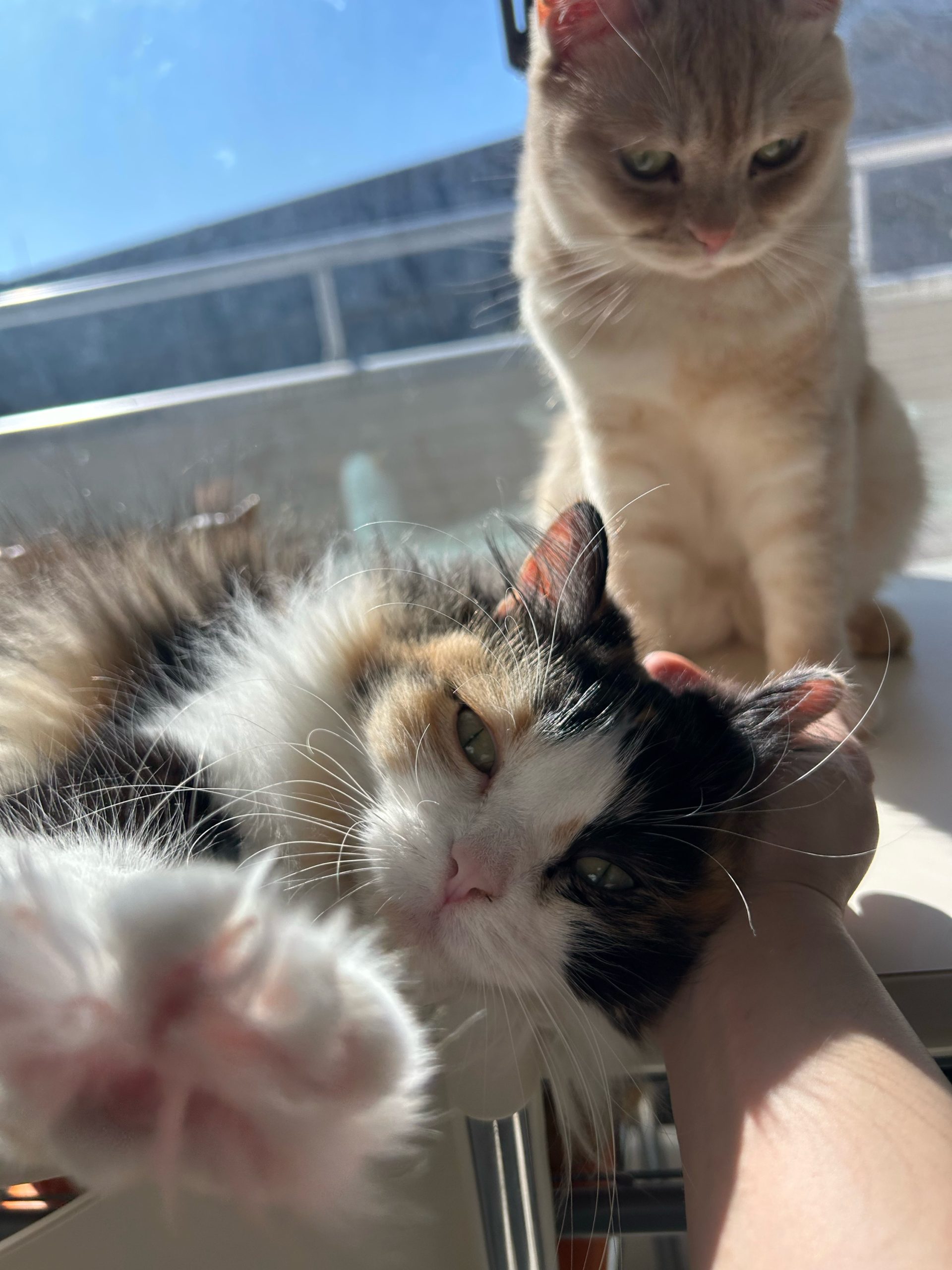 また、なぜかまるくんも自力じゃ降りられない〜💦と、キャットタワー最上段にいらっしゃいました🐱
