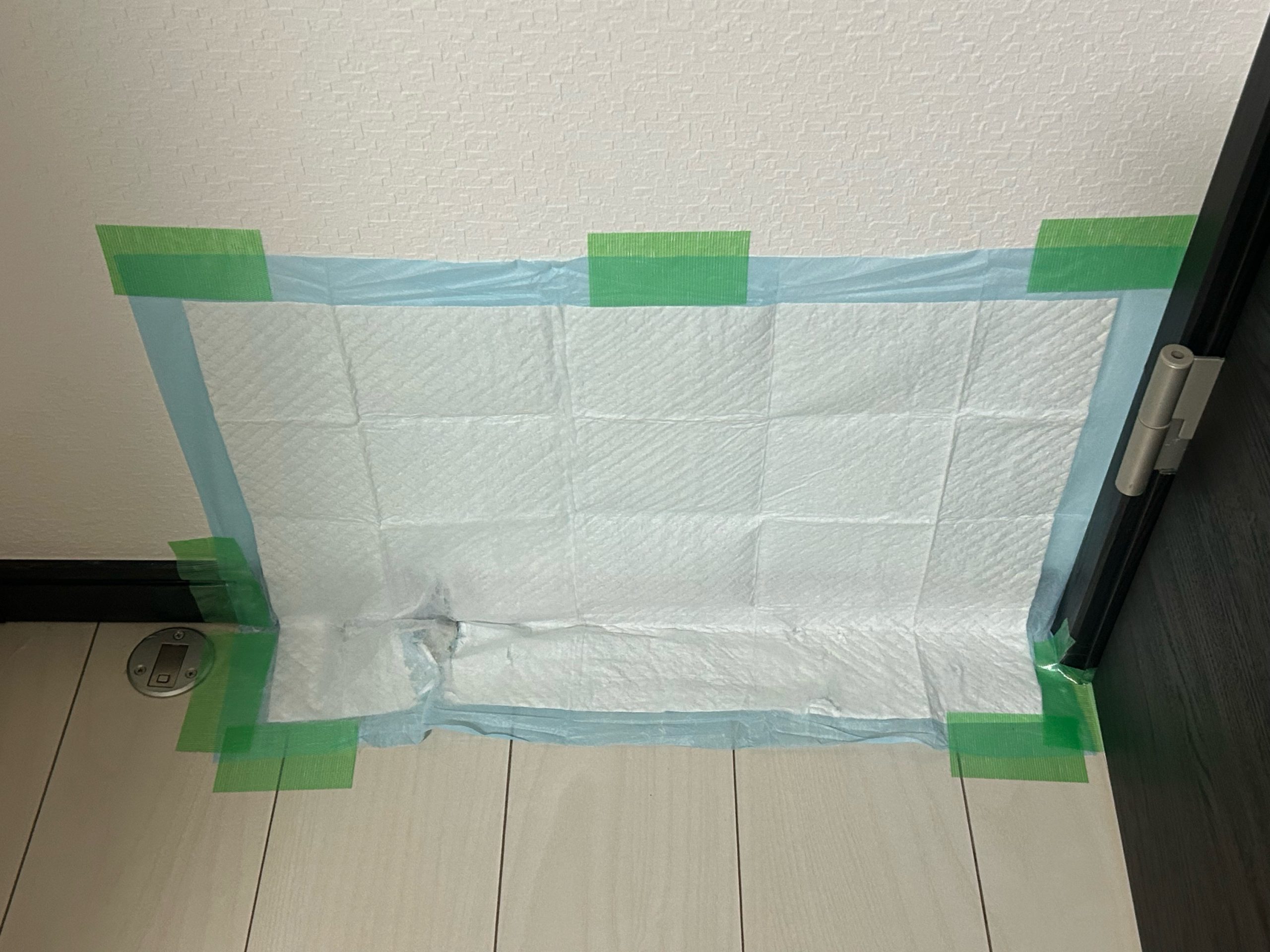 防水剤を塗っていたので染みないでいたかと思いますが、この場所が気に入っているようなので、念の為にシートを1枚貼ってみます。
