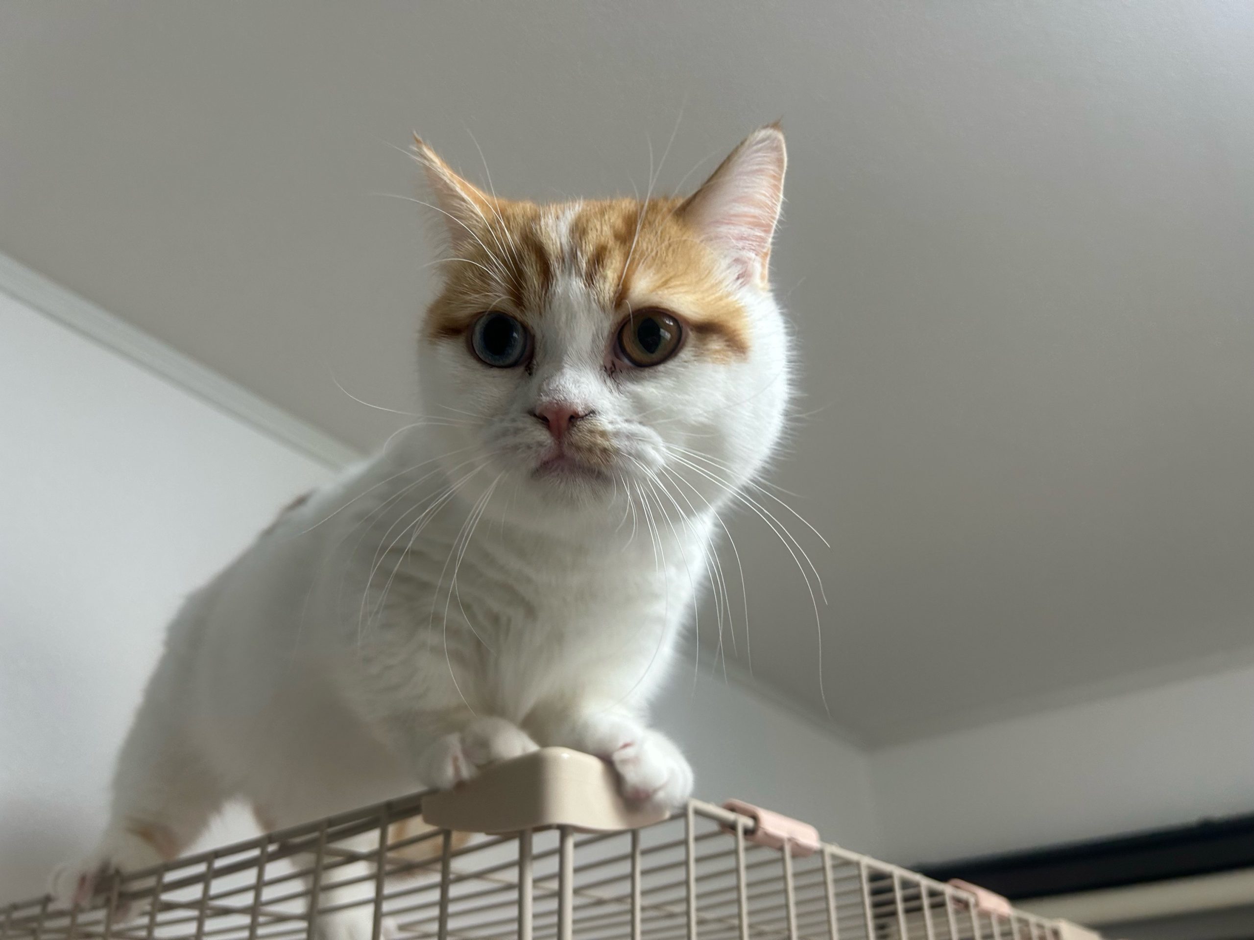 午前:入室するとちくわくん、まるくんがそれぞれ高くて降りられない〜というお顔・鳴き声で最上段に💦