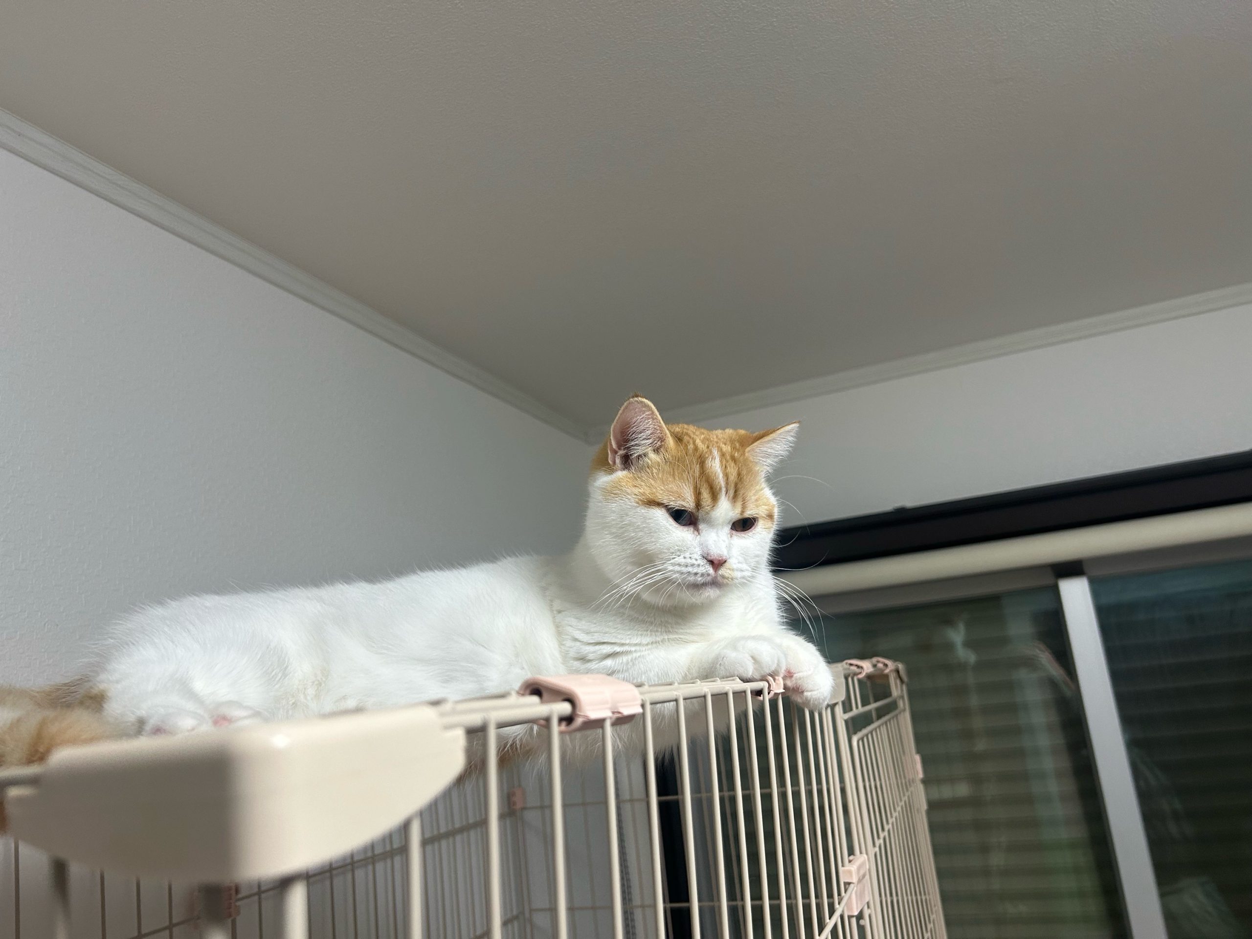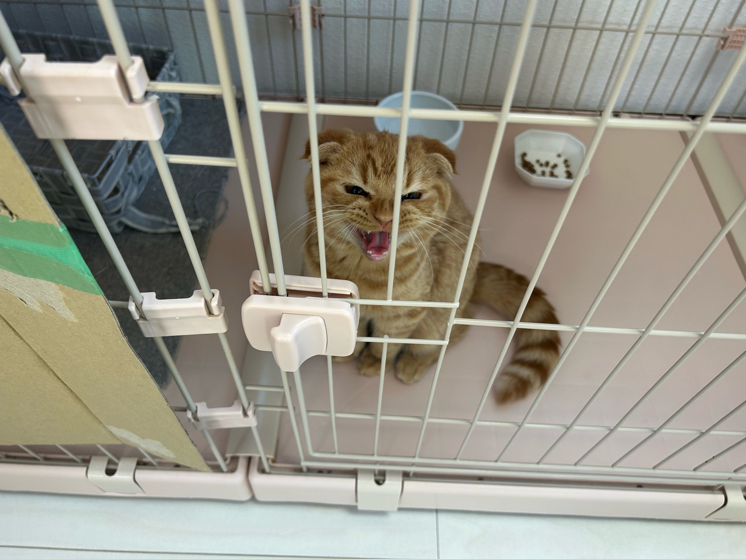 ちくわくんは今日もケージの上に登り、降りられないのお顔と鳴き声でお出迎え💦