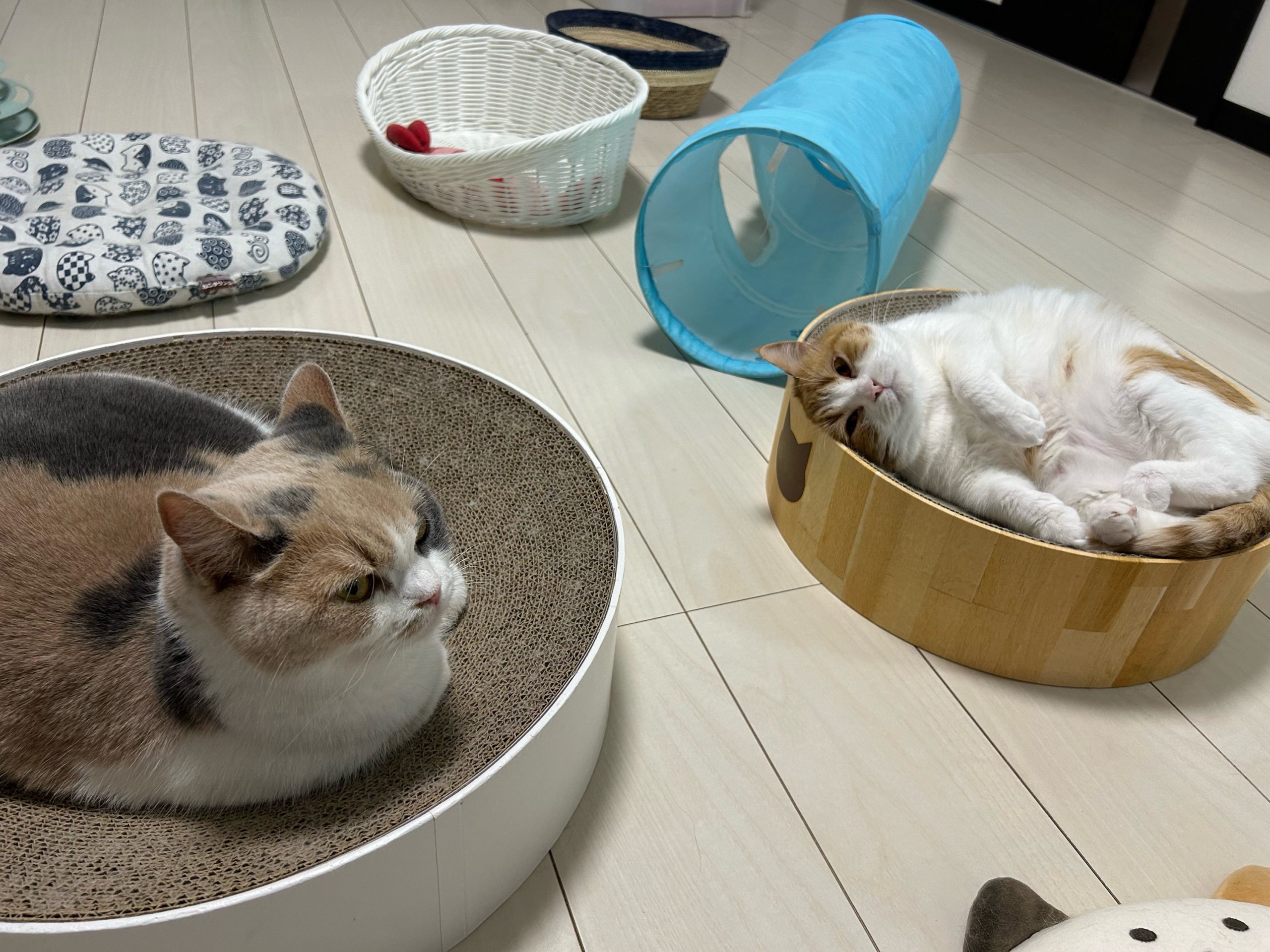 雨音の中ぐっすりだったようで、猫ちゃんたちは寝起きのお顔😴