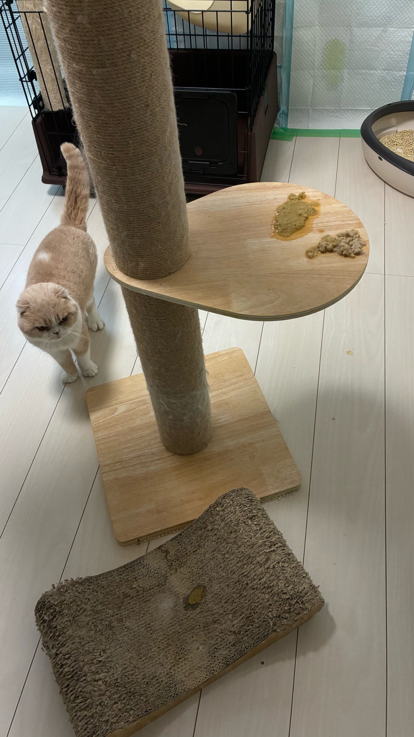 午後:まるくん再びフード嘔吐、とのまる部屋の湿度が高めで床がべたつきました