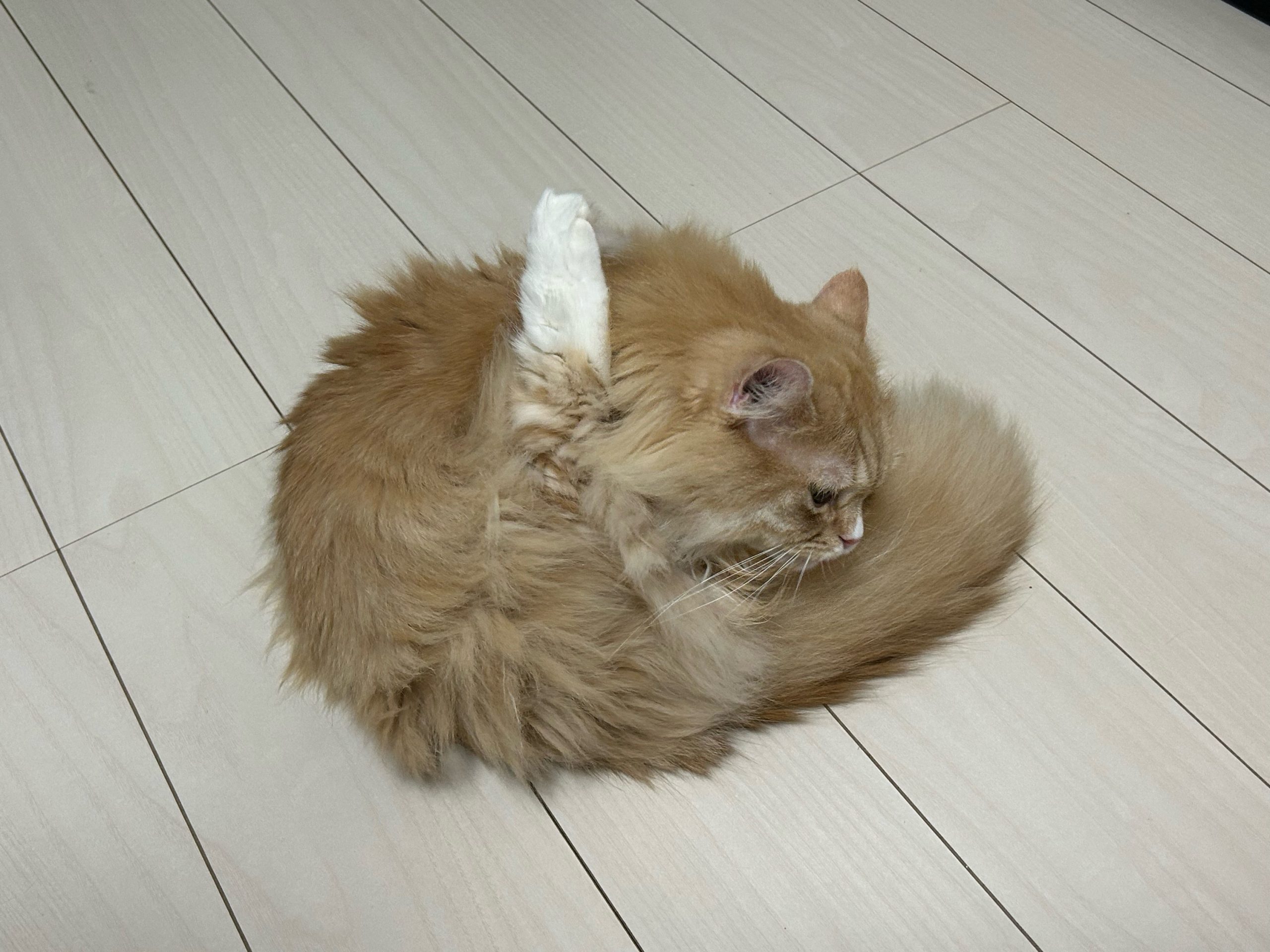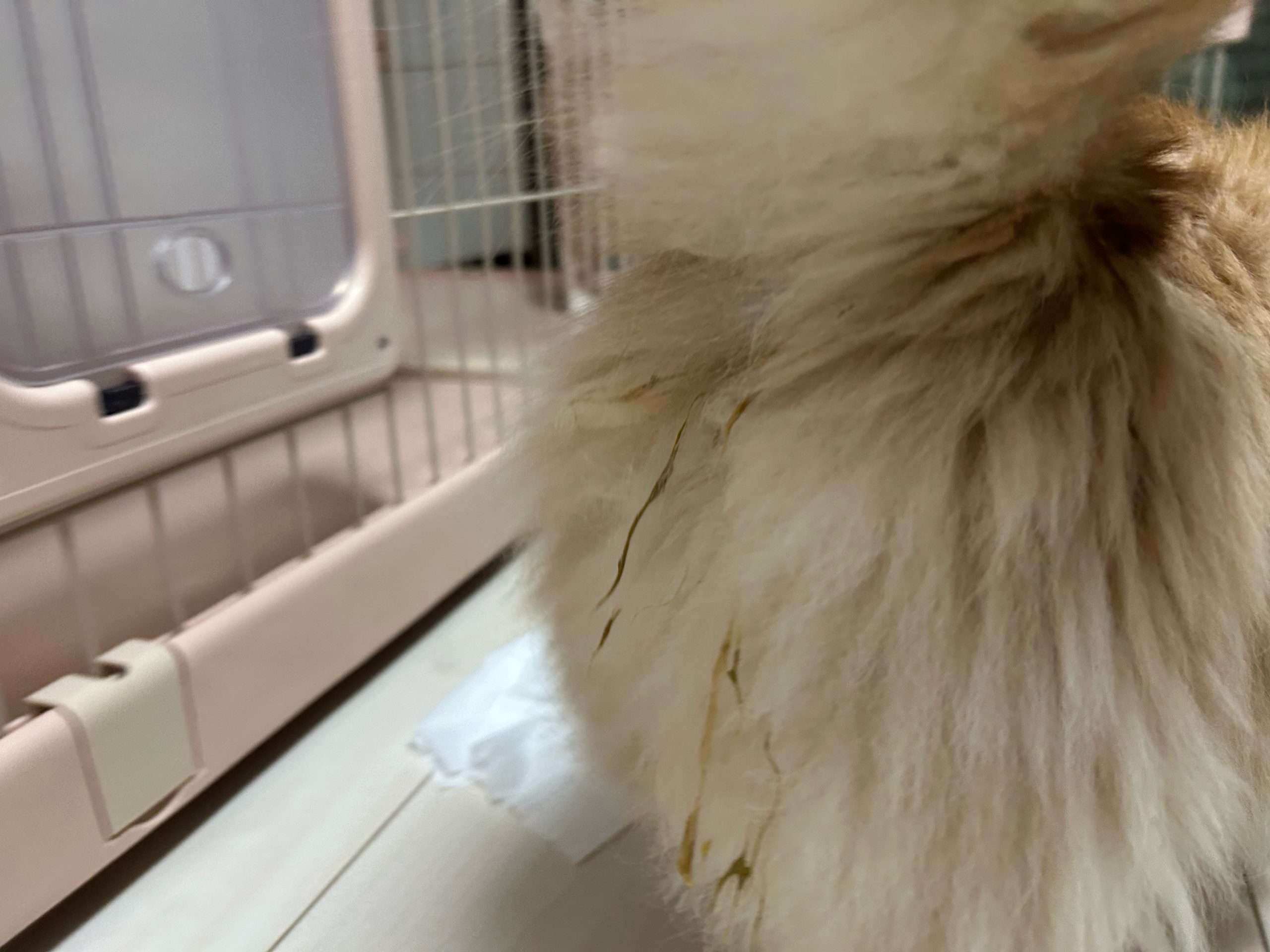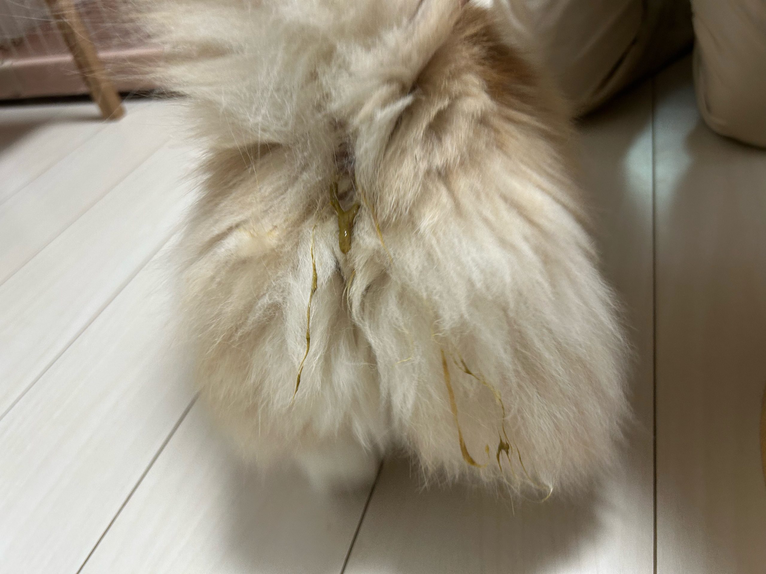 お尻の毛にベッタリ付いており、ウェットティッシュとブラッシングで取れる範囲をケアしました✨