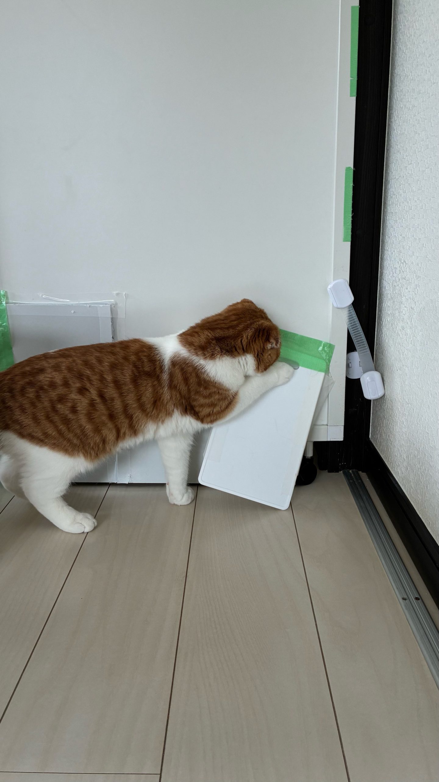 親猫の真似をするのかロコ赤ちゃんのはるくんはバリケードのまな板を剥がすのに協力的🤝