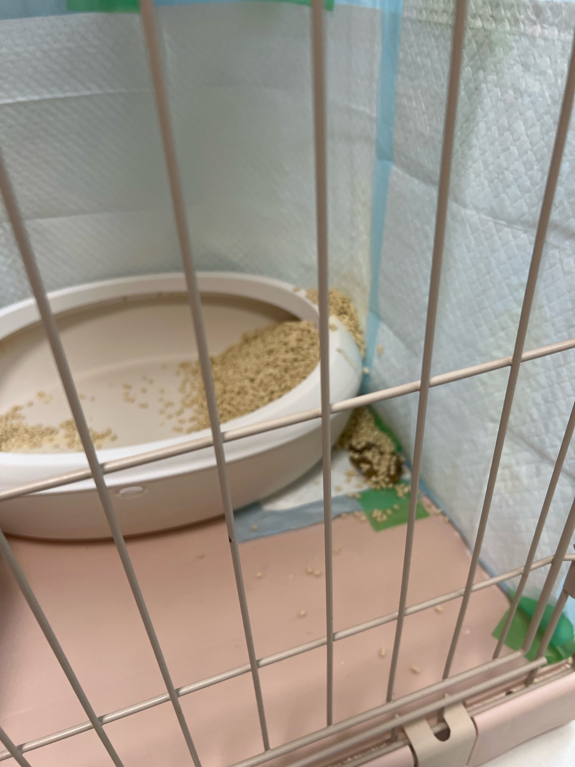 殿むぎケージのトイレが傾いてしまったようで砂などがこぼれていました