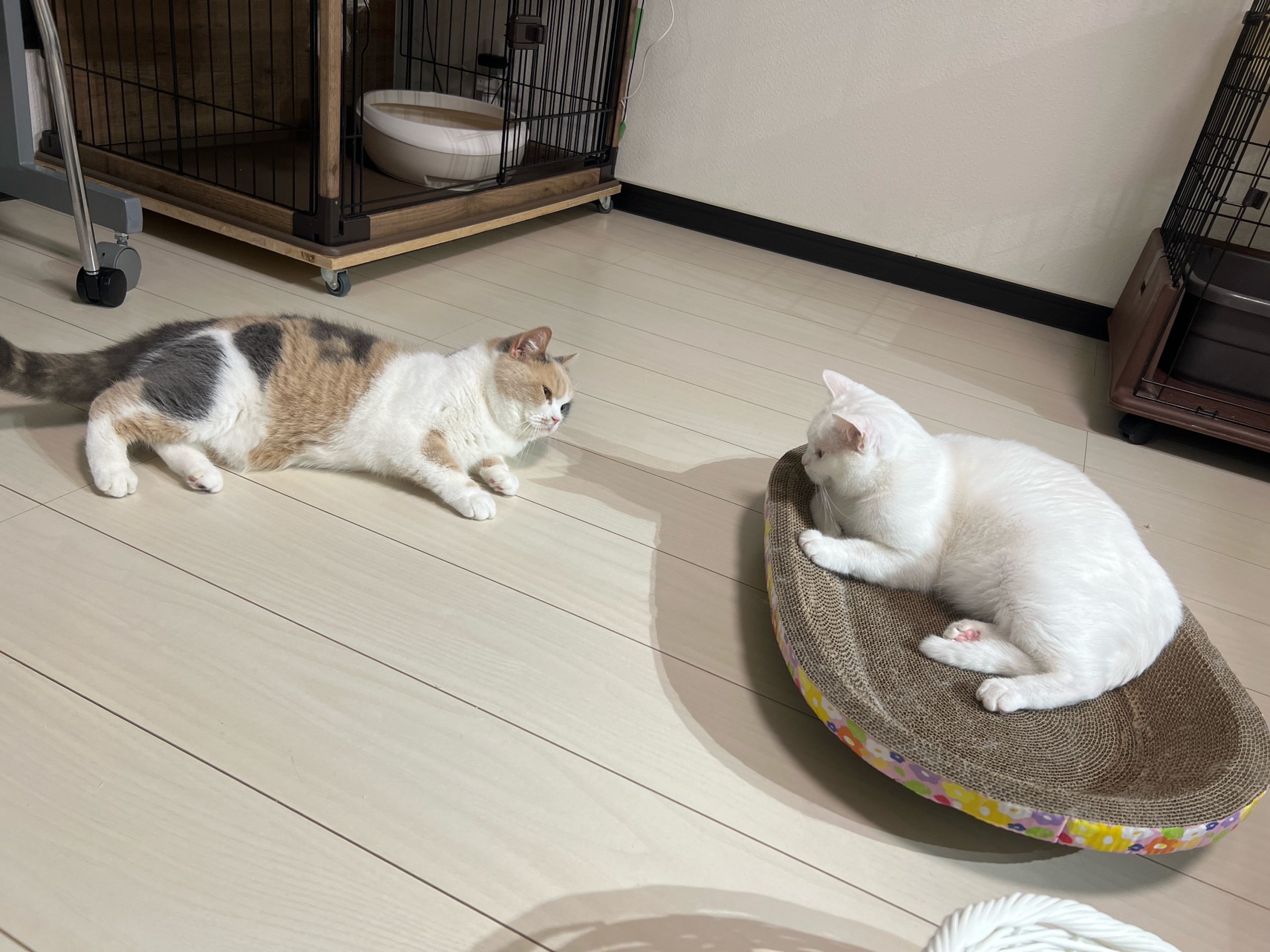 ですが、むぎちゃんのアピールには近寄らず、近寄ってもむぎちゃんに猫パンチされ…💦