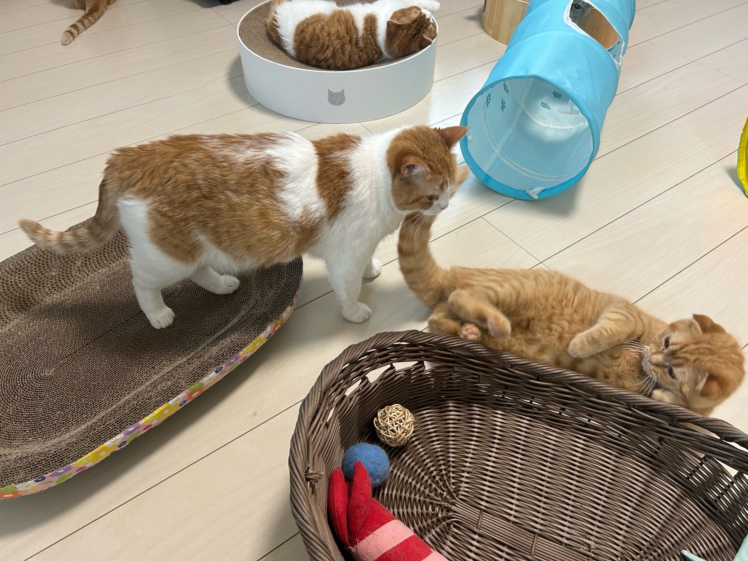 その後、他のみんなも意欲が出てきてしまったようで…気付かぬうちにむぎ、はなが侵入しておりました😂オープンついでに子猫たちの大好きネズミおもちゃ🐀を出すとすぐに駆け回ります。