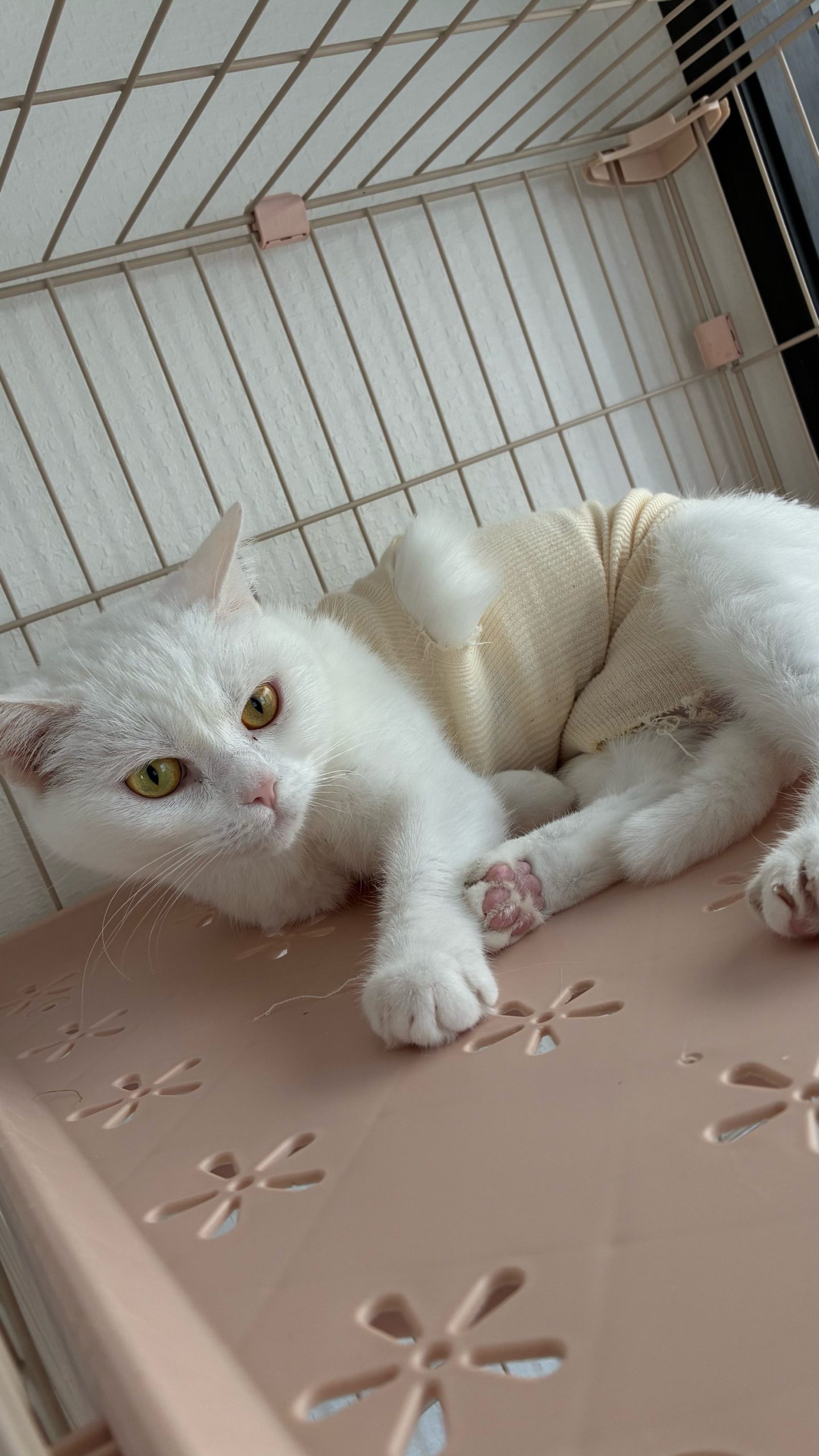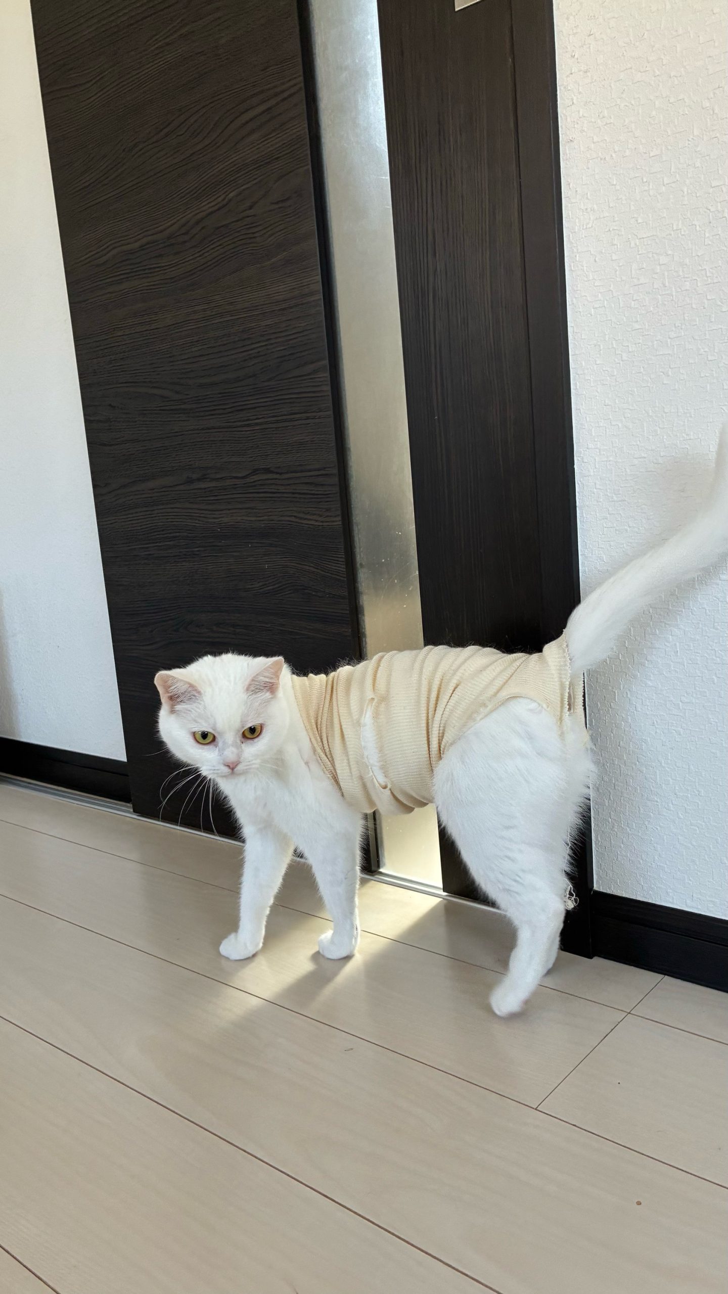 おこめちゃん腹巻きスタイルでいてくれましたが、やはりその後にはぬいでしまっていました🥲まだ今朝も血尿がみられます。