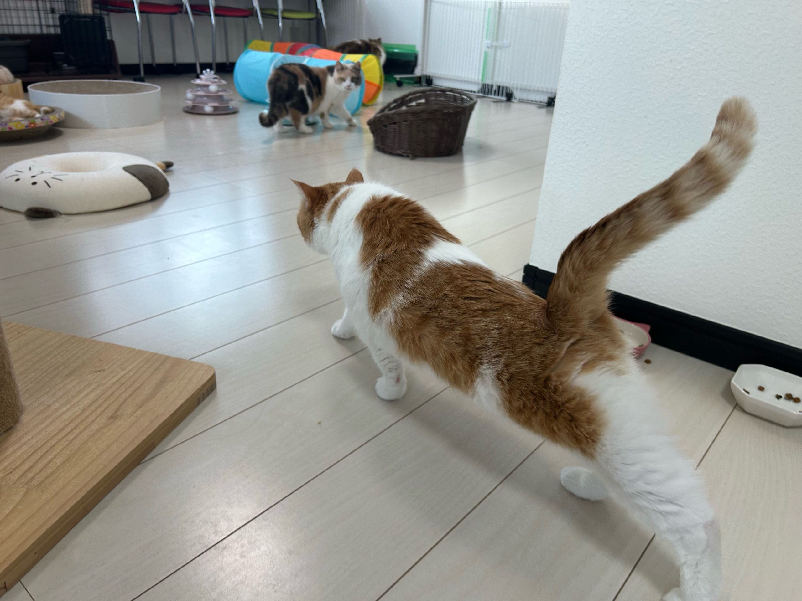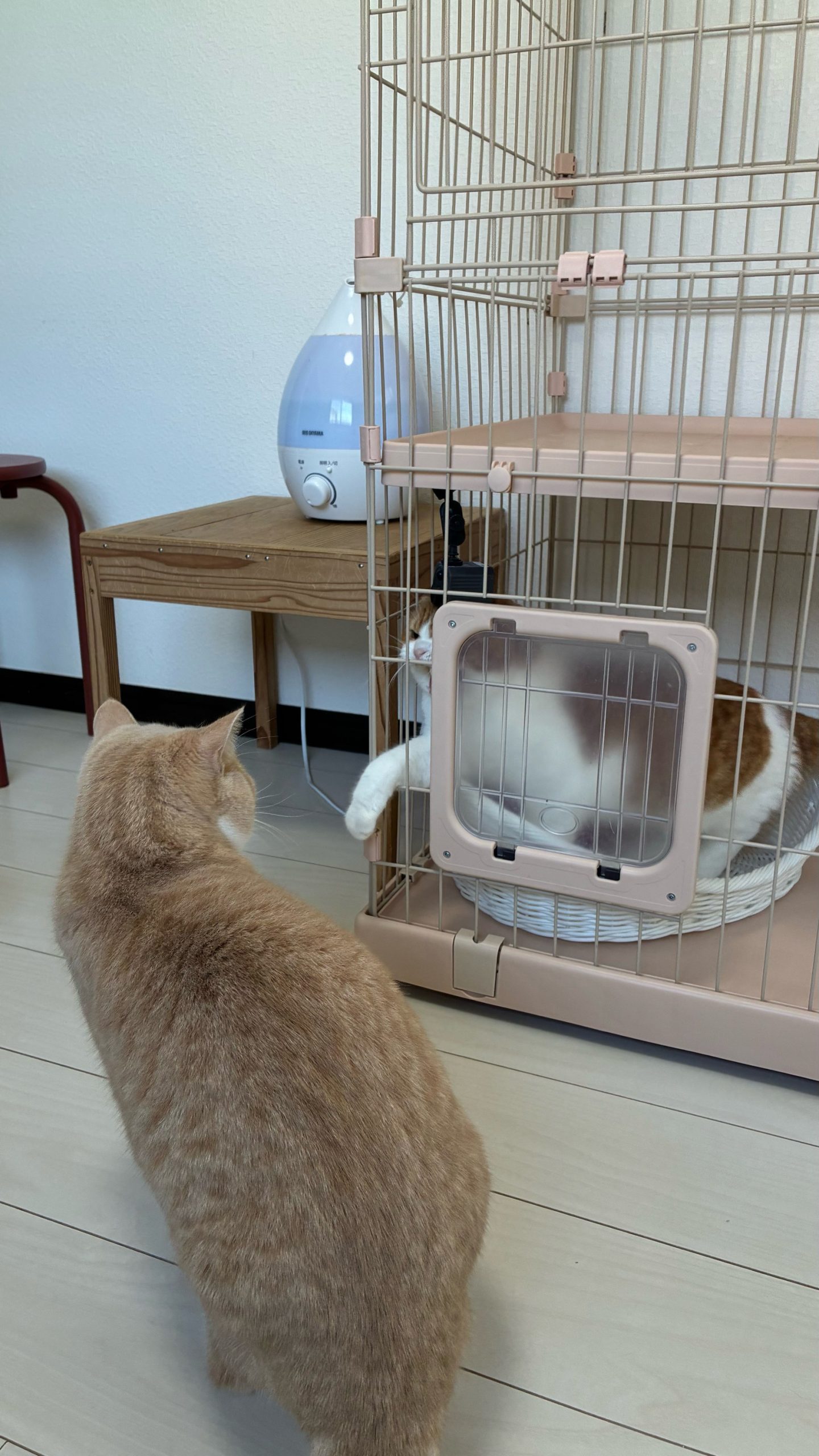 まだばく・きびまいにはかなりシャーシャーモード。きびくんもシャーシャーがうつり、たまに威嚇返し💥しかしはるくんのが強く、ケージからにゃんこパンチをくりだしたりしています、、、きびまいくんは悲しそうに去ります。