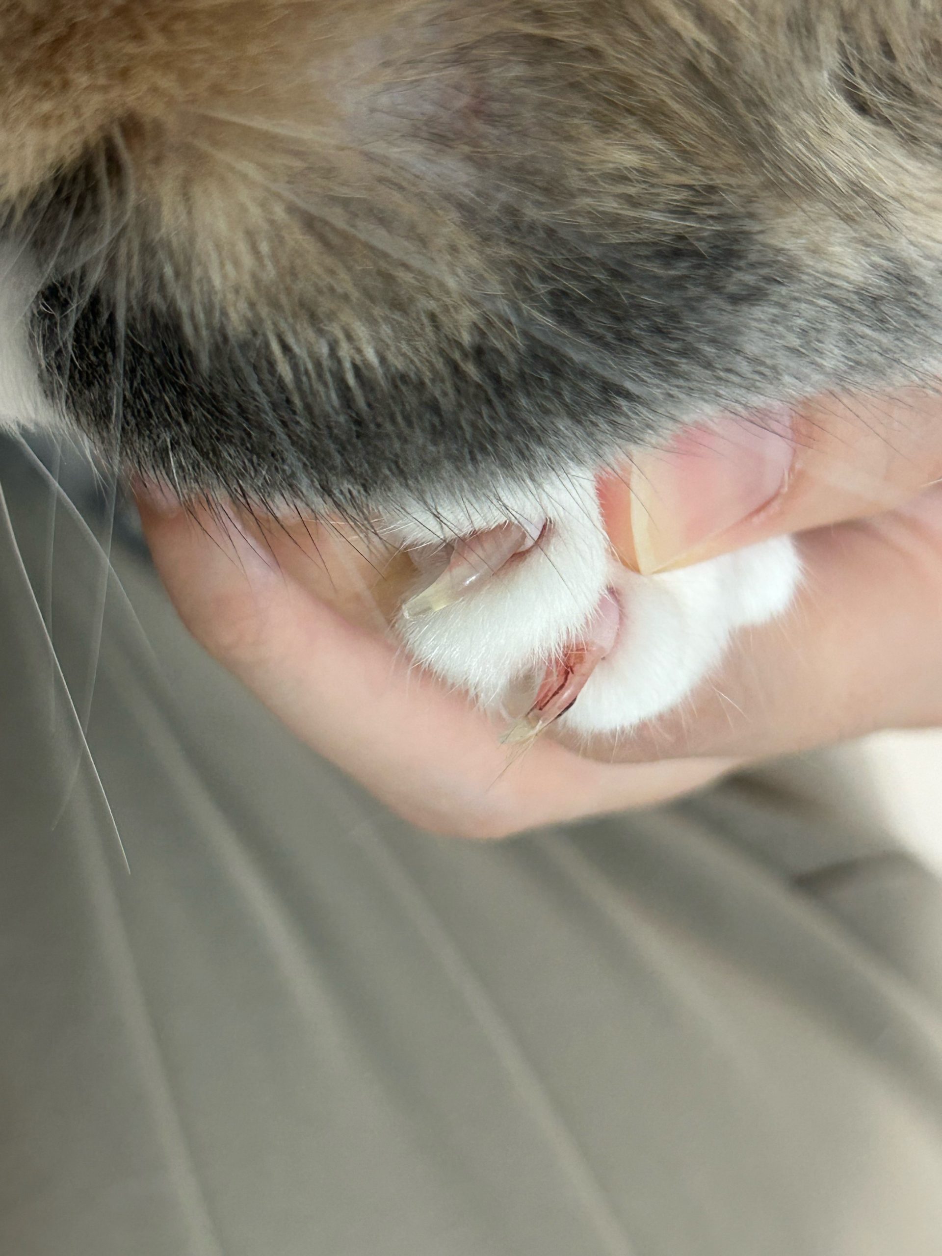 抱っこして確認してみると、やはり今朝の記録通りバトル参加猫のようで、周囲に唸り声・爪2ヶ所(右前足親指・左前足薬指)から出血の跡ありでした🩸