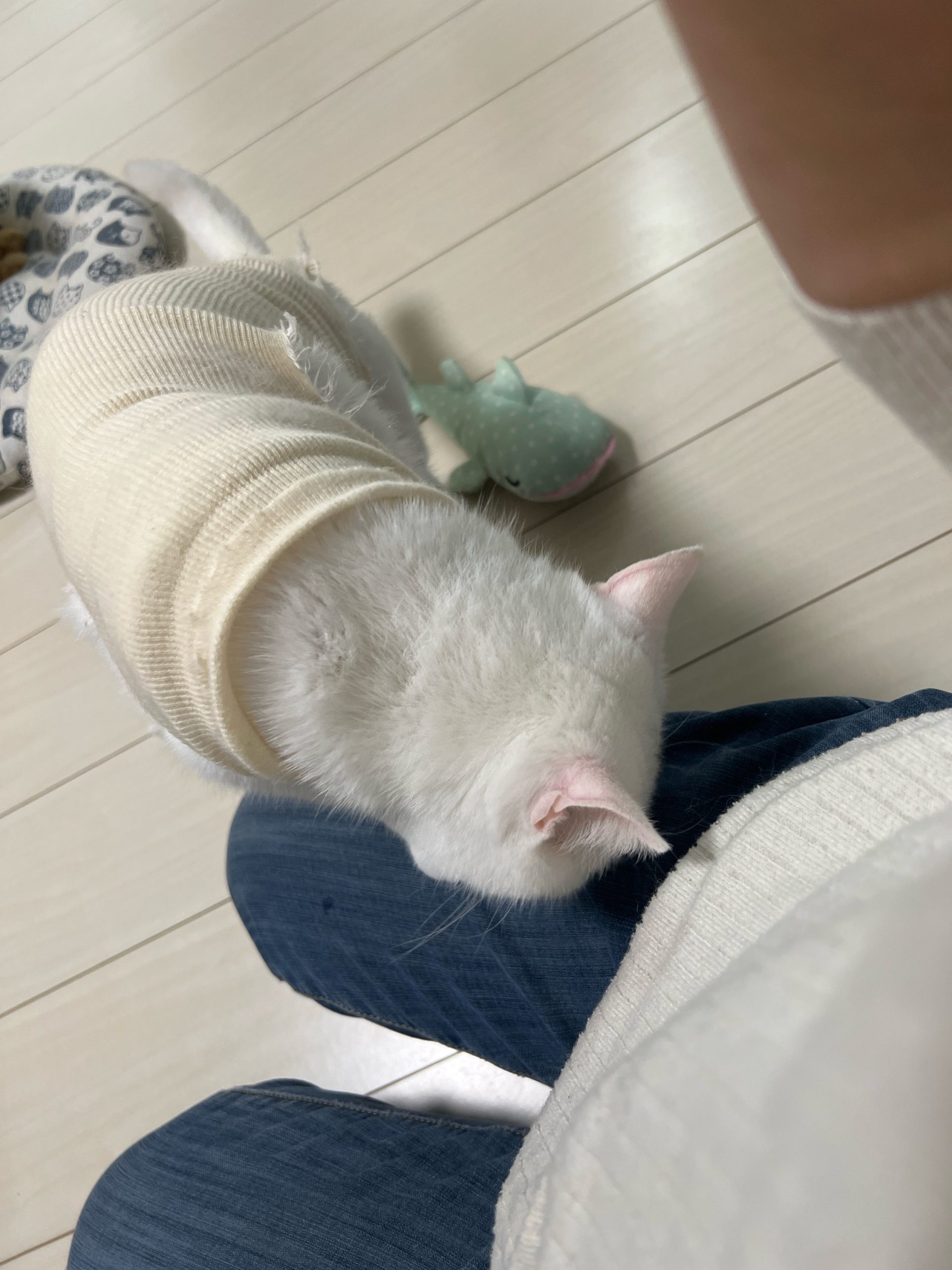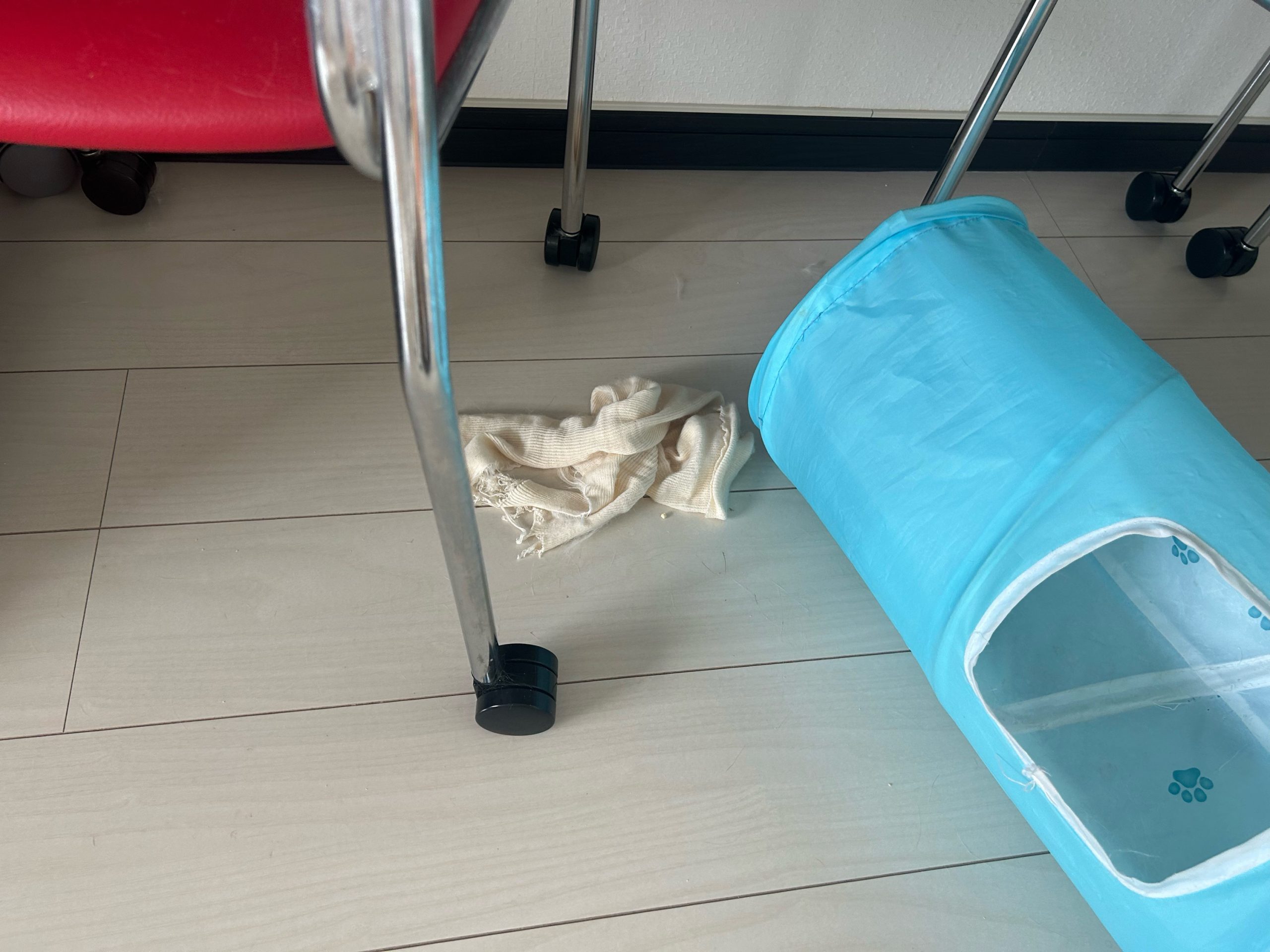おこめちゃんはお洋服を脱いだようですが、ケージ外の猫ちゃんたちにお洋服を誘拐されイスの下に🪑👗