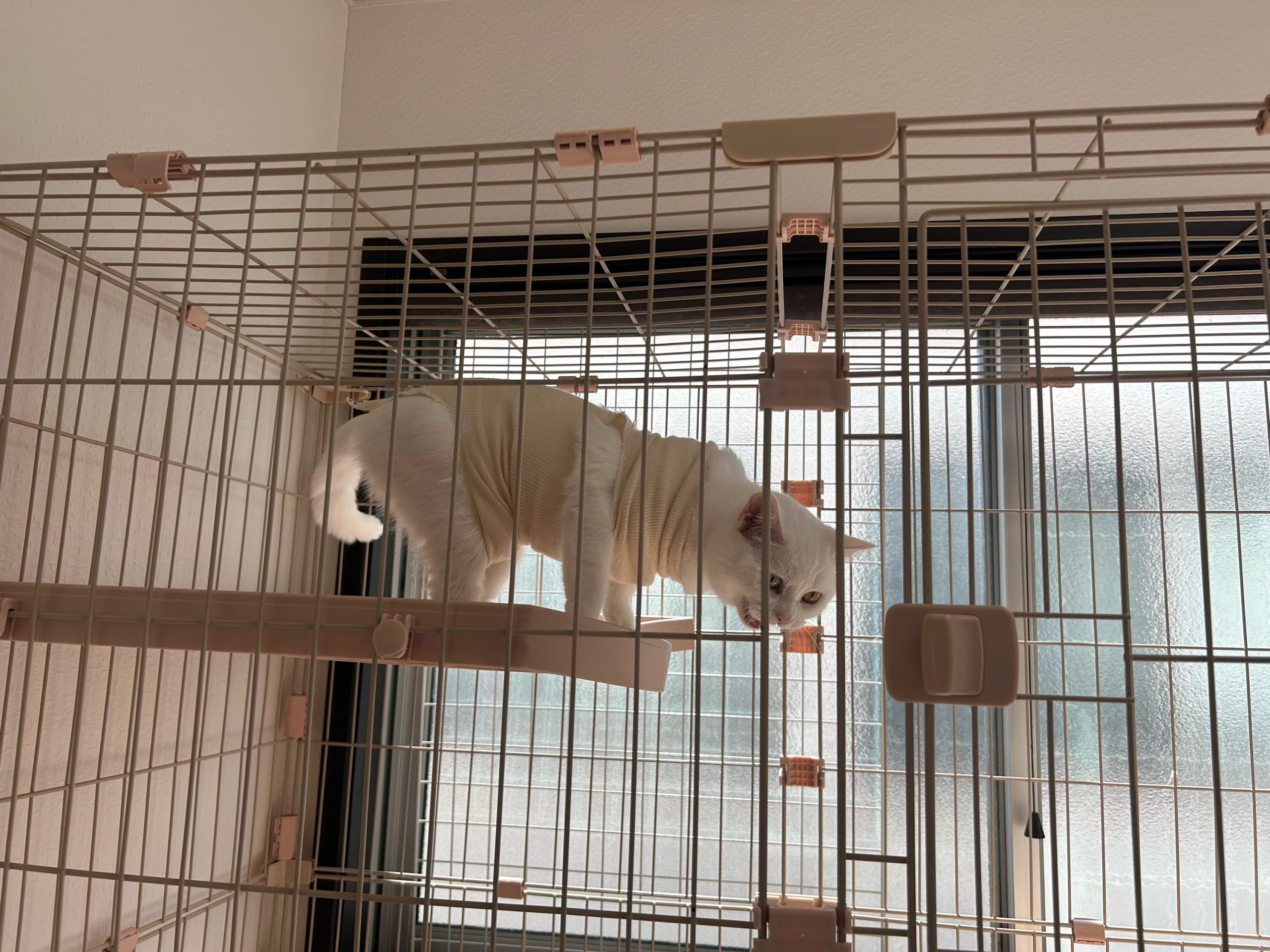 おこめちゃんは縦長ケージ上の段でリラックスしていたので、ご飯お水はそちらに移動しました🏠