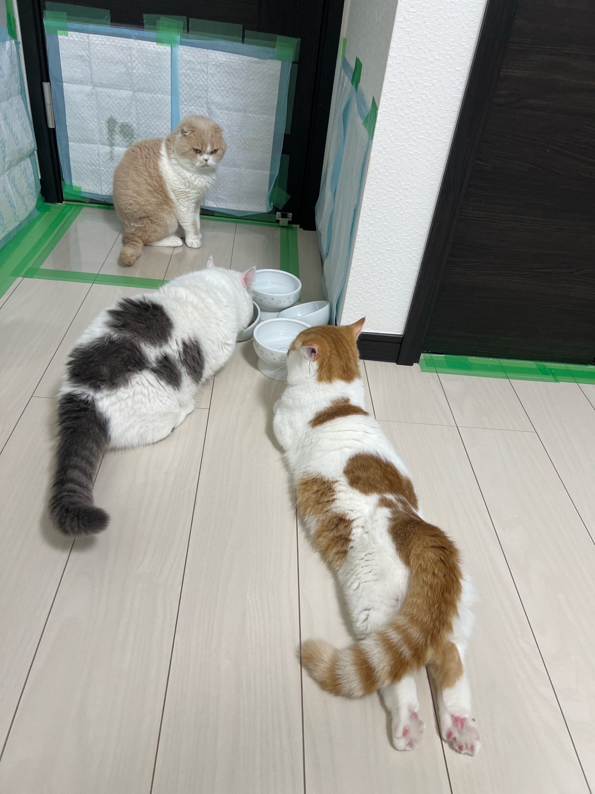 またテープ剥がし職人が多数。げんまいくんが勝ち取りましたが、すぐに回収😂またげんまいくんも甘えモードでロコちゃんのにふみふみお乳を吸います🍼